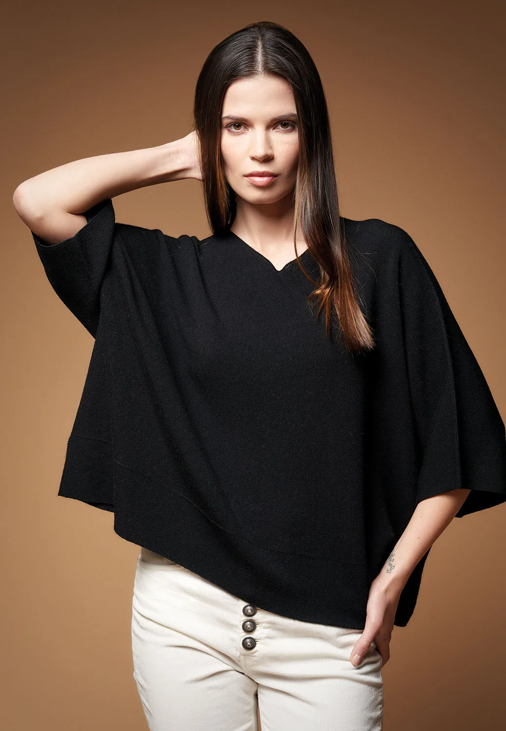 Arovescio strik i sort, lækker blød med halvlange ærmer, slidser i siden og V-hals, modellen er en bred kort model.