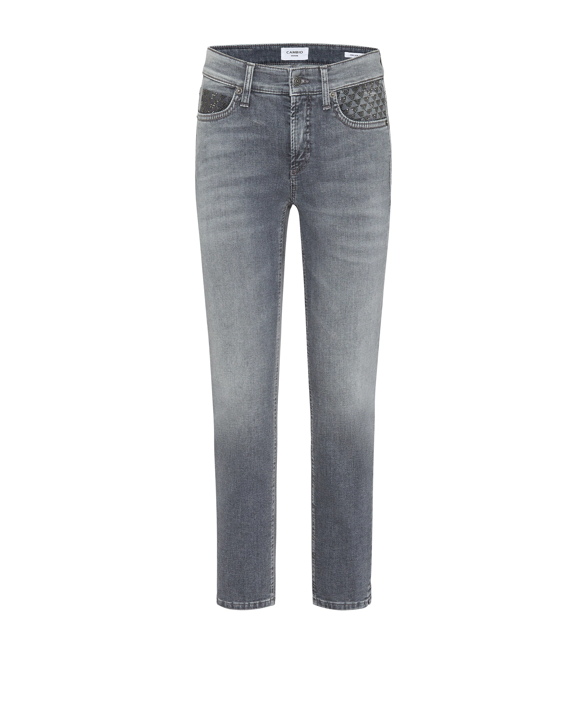 Cambio Piper short – grå denim, buksen er en stumpebuks som er smal og med en supergod pasform. Buksen har sten foran på lommen og en lille slids forneden. Normal i størrelsen