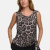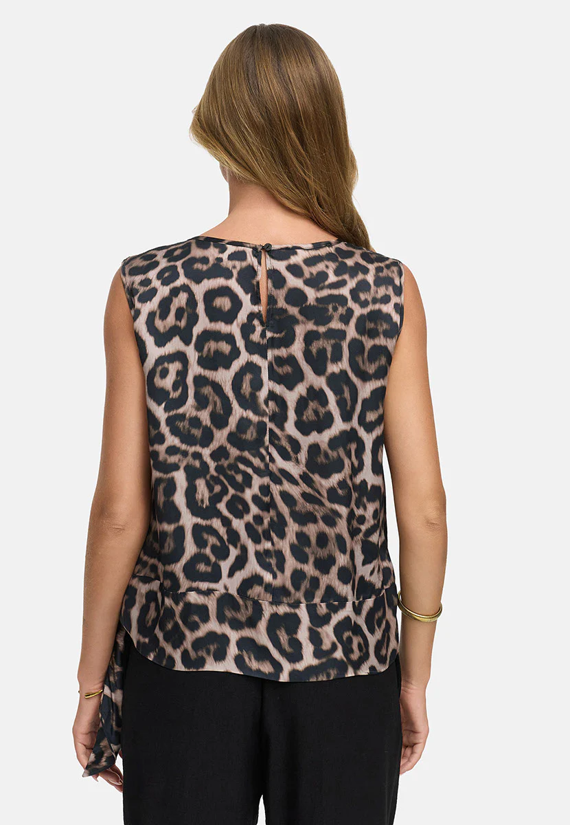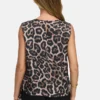 Catnoir top – leopardprint. Dette er en smuk leopardmønstret wrap-top, denne top har brun, sort og lys brun gennem hele mønsteret. Dette er en fantastisk top til at tilføje lidt kontrast til et outfit. Denne top har et wrap- og slipsdesign, rund halsudskæring og ærmeløst design.