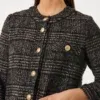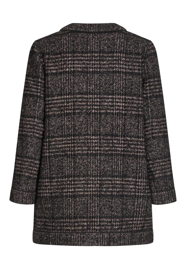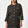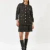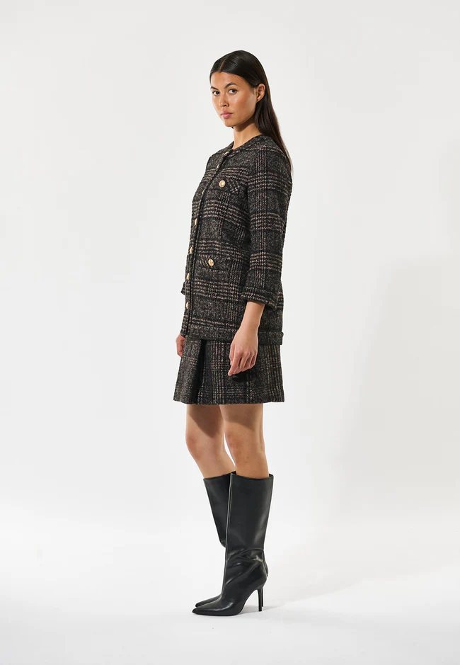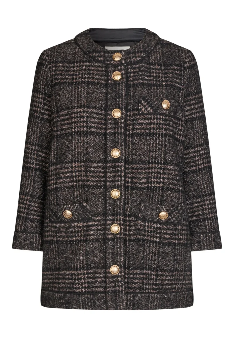 Dea Kudibal Aisha jakke- Black Check, denne flotte jakke har store dekorative messingknapper, påsyede lommer og tweedy-ternet stof og rund hals. Piping løber rundt om søm, ærmer og krave som en ekstra diskret detalje. Jakken er lige, går ned til hoften og er fuldt foret med strækfor for ekstra komfort. Modellen er 177 cm høj og bruger en størrelse S