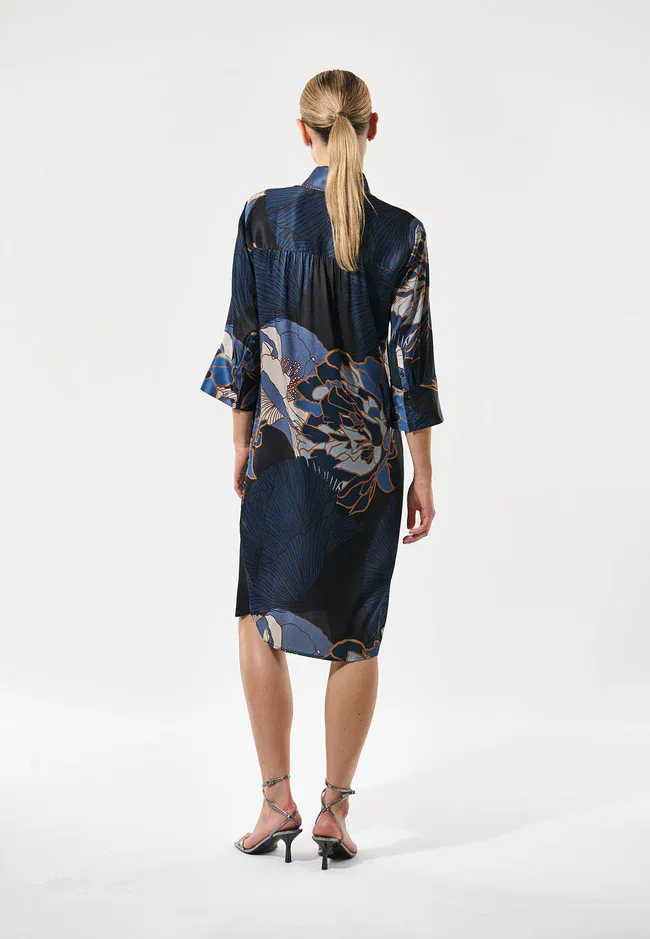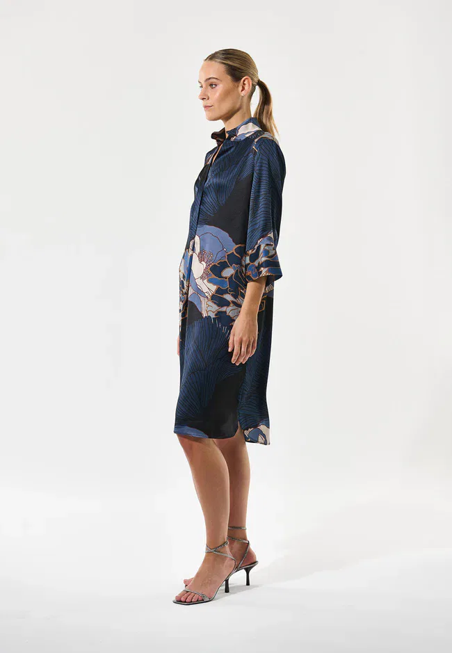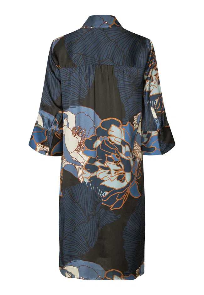 Dea Kudibal Kamilles – sikekjole- Alepidia Blue, en lækker skjortekjole i silke der er stilfuld, afslappet og let at style. Den elegante halsudskæring, høje krave og de høje manchetter er kimono-inspirerede, og det flotte print tilføjer et moderne touch.
