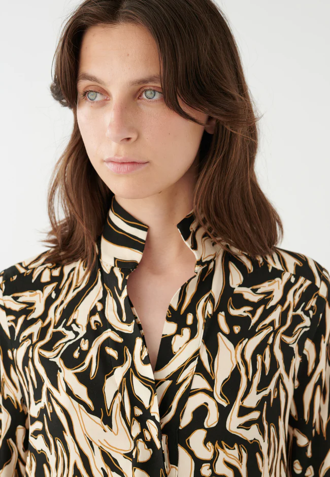 Dea Kudibal kjole i viscose Kamille Rapture, en lækker skjortekjole i viscose der er stilfuld, afslappet og let at style. Den elegante halsudskæring, høje krave og de høje manchetter er kimono-inspirerede, og det flotte print tilføjer et moderne touch.
