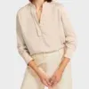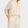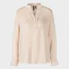 Marc Cain Collections bluse, denne ensfarvede bluse kommer i en afslappet pasform med læg bagpå for nem bevægelse. Crossover-halsudskæringen er færdig med parallelle quiltede sømme og smelter sammen til en lille stand-up krave. Blusen er designet med signatur manchetærmer. Den afrundede kant forlænges bagpå og har et MC metallogo foran.