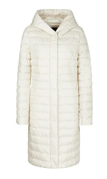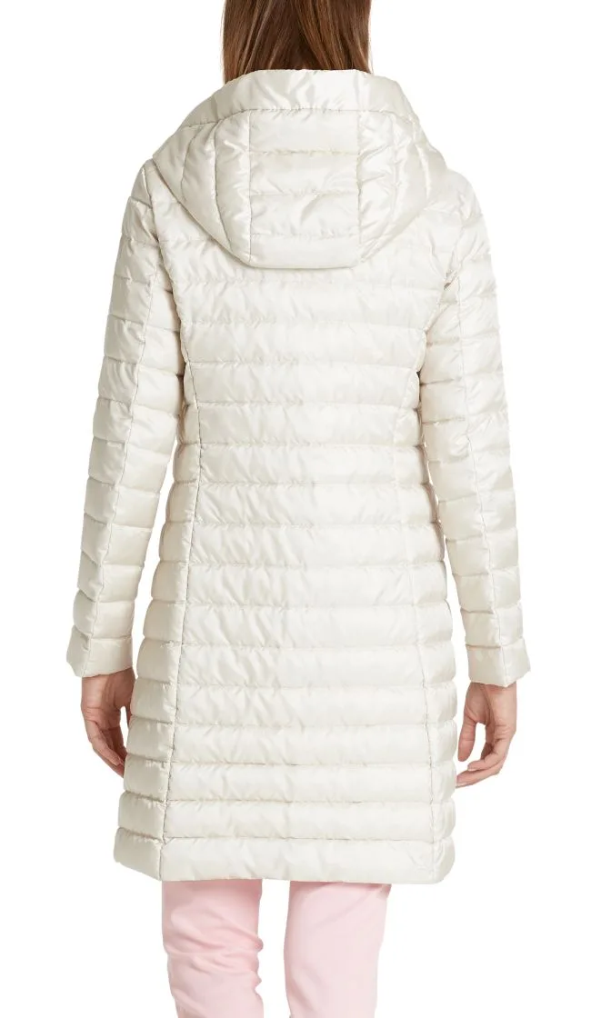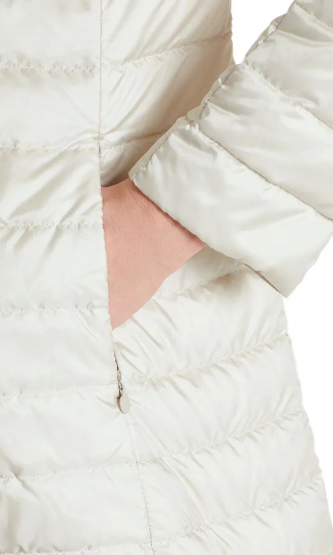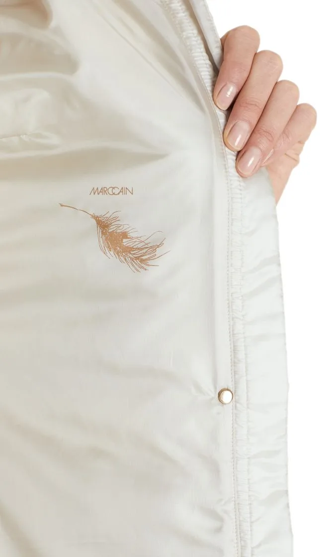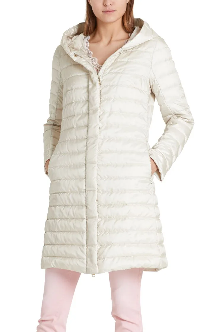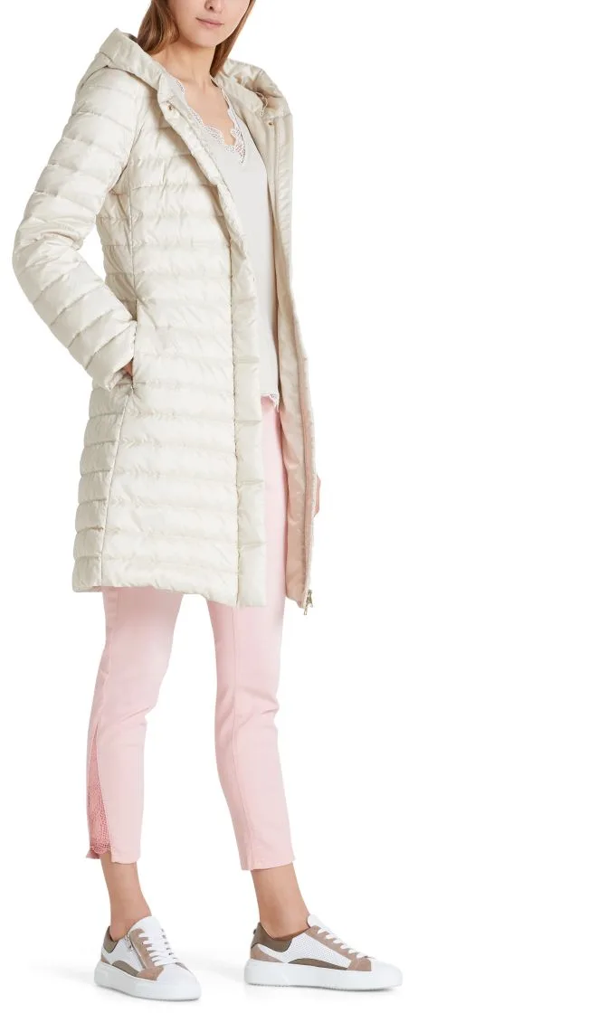 Let feminin dunfrakke fra Marc Cain Collection, frakken er med en hætte, tovejs lynlås og små trykknapper. Indsatte lommer med usynlige lynlåse. Den lækre dunfrakke er kærligt gjort færdig indeni med delikat blonder.