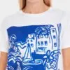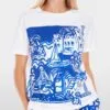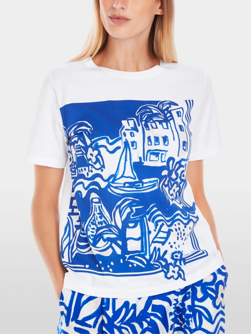 Marc Cain Collections Rethink Together T-shirt med print. Denne printede T-shirt i et Francis-design bringer sommervibes til enhver stil. Den imponerer også med sin rene økologiske bomuld. En bred rund hals og let skræddersyet snit fuldender det cool look. Modellen er 179 cm og bruger str. 38
