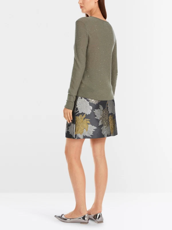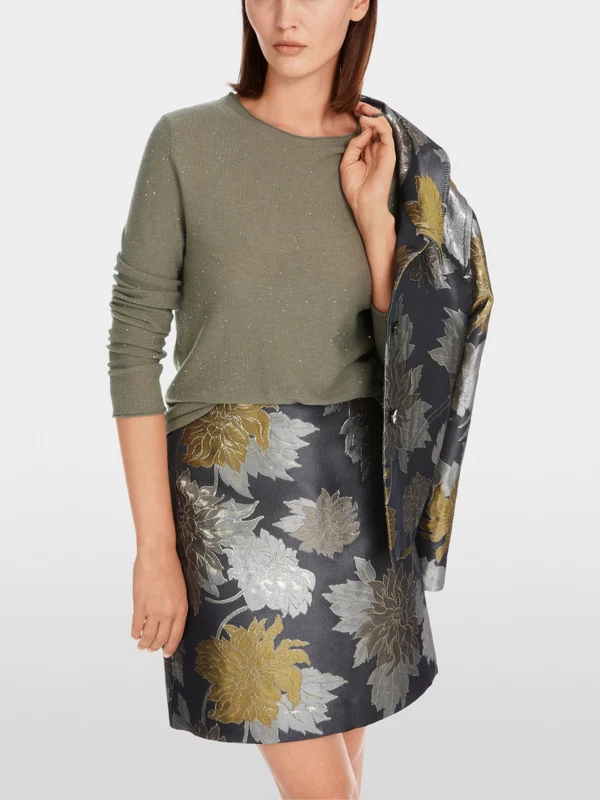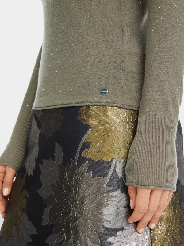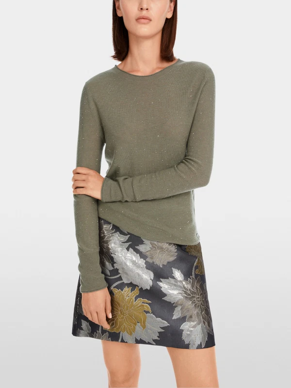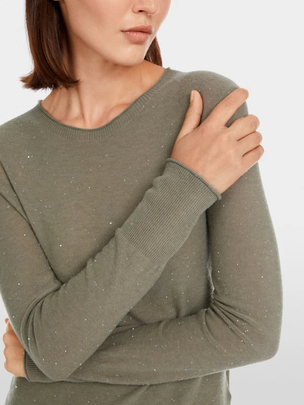 Marc Cain Collections rundhalset uldsweater. Denne sweater fanger opmærksomheden med sit delikate, let gennemsigtige materiale. Den fine uld er pyntet med små pailletter. Sweateren er skåret i en figursyet stil og har lange ærmer. Denne beklædningsgenstand er den perfekte basis for et moderne, luksuriøst look. Modellen er 179 cm og bruger str. 38