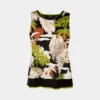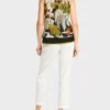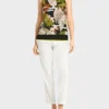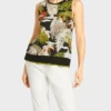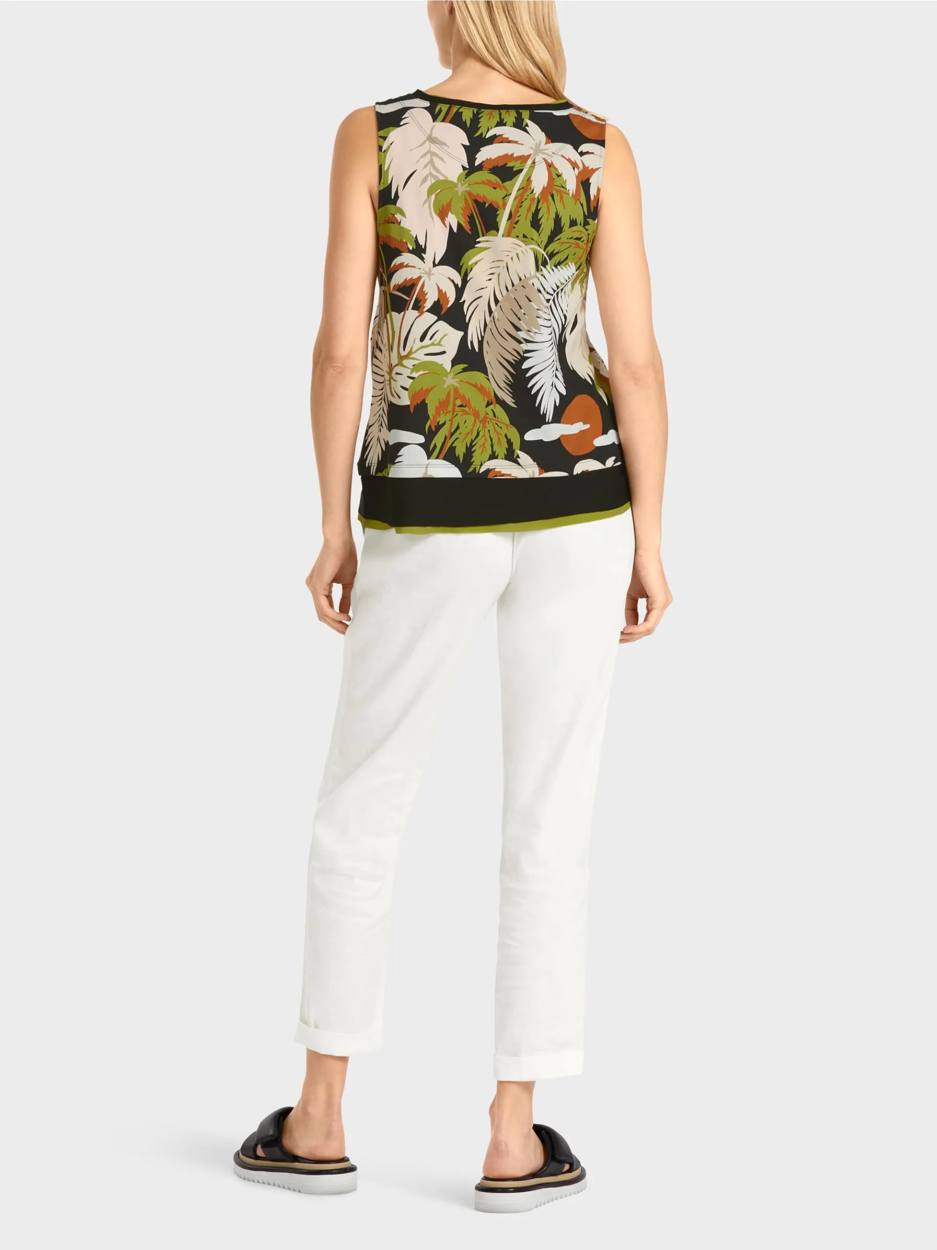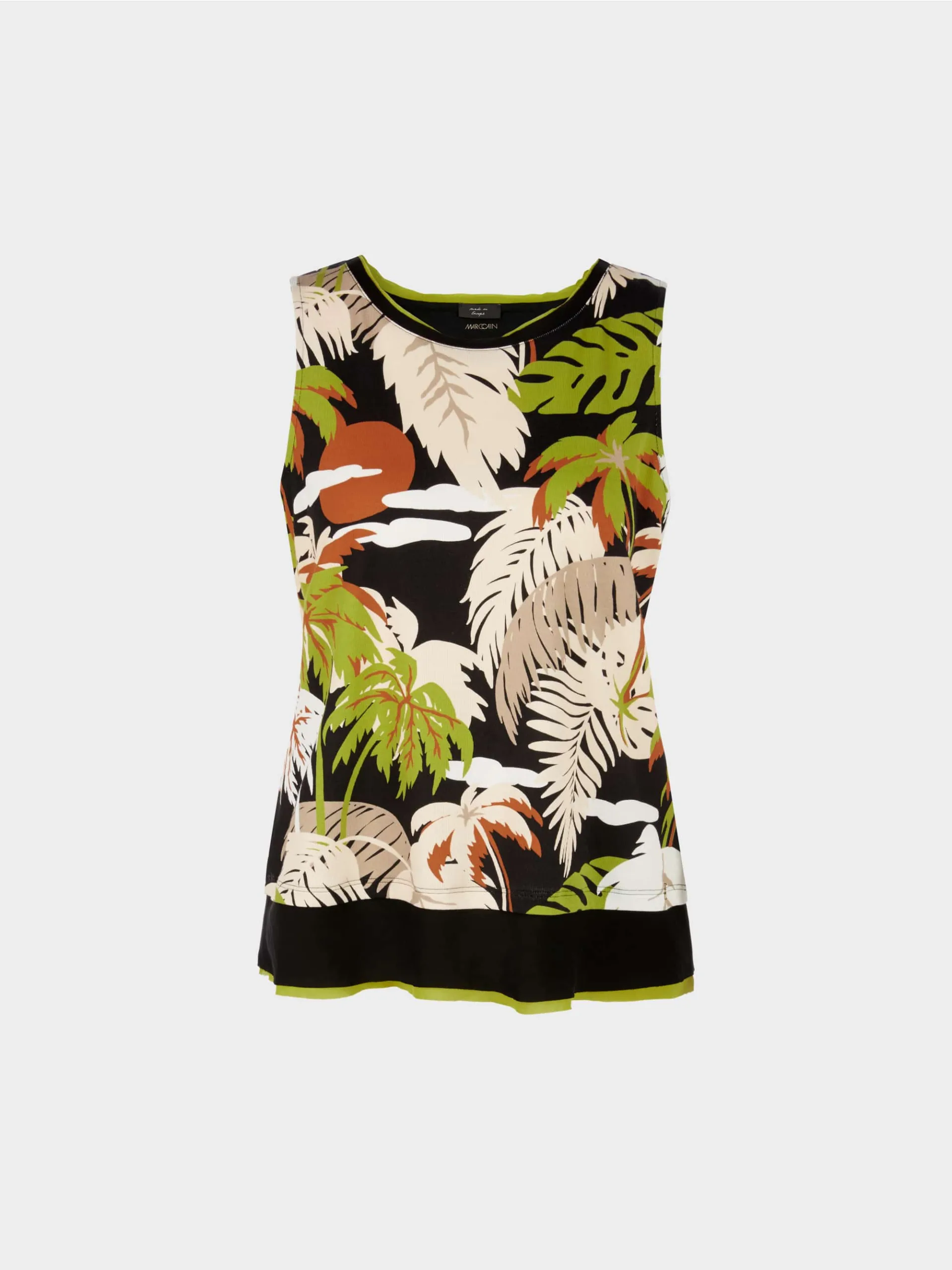 Marc Cain Collections top med tropisk print, denne ærmeløse top i bomuld med elastan er løstsiddende, kanten forneden fremhæves af en lagdelt effekt. Lagdelingen består af to lag bomuldsstof, der står i kontrast til toppens ribbede strik.