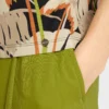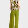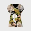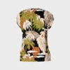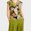 Marc Cain Collections top med V-hals i tropisk print, toppen er med kort ærme og trykt med stiliserede motiver af et tropisk landskab og har en kontrasterende kant på halsudskæringen, toppen er lavet i fin ribbet bomuld, er fleksibel og føles blød mod huden.