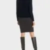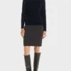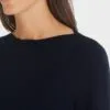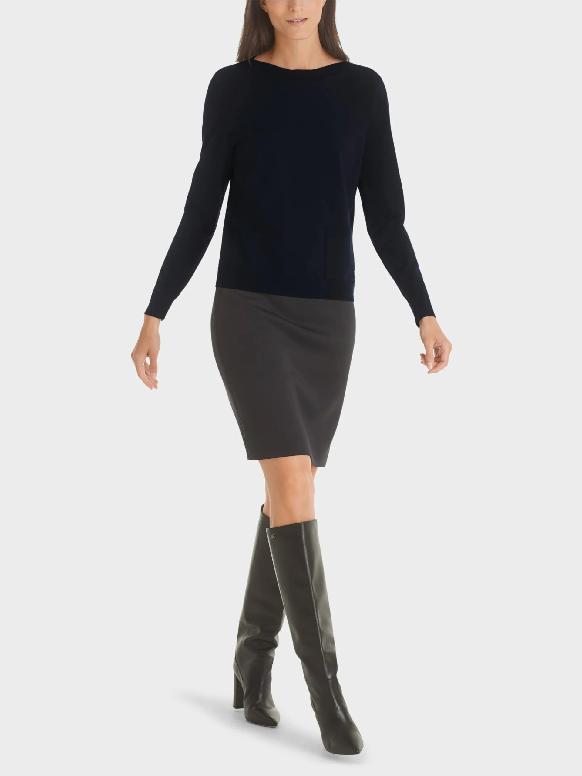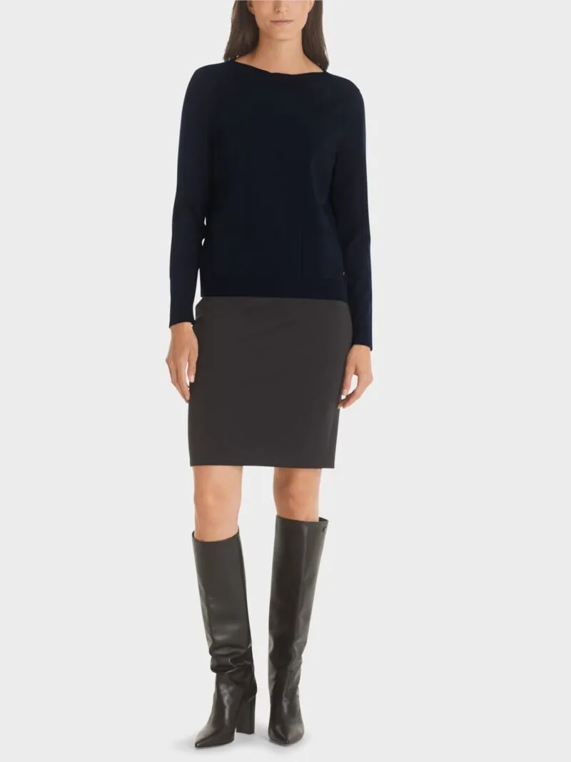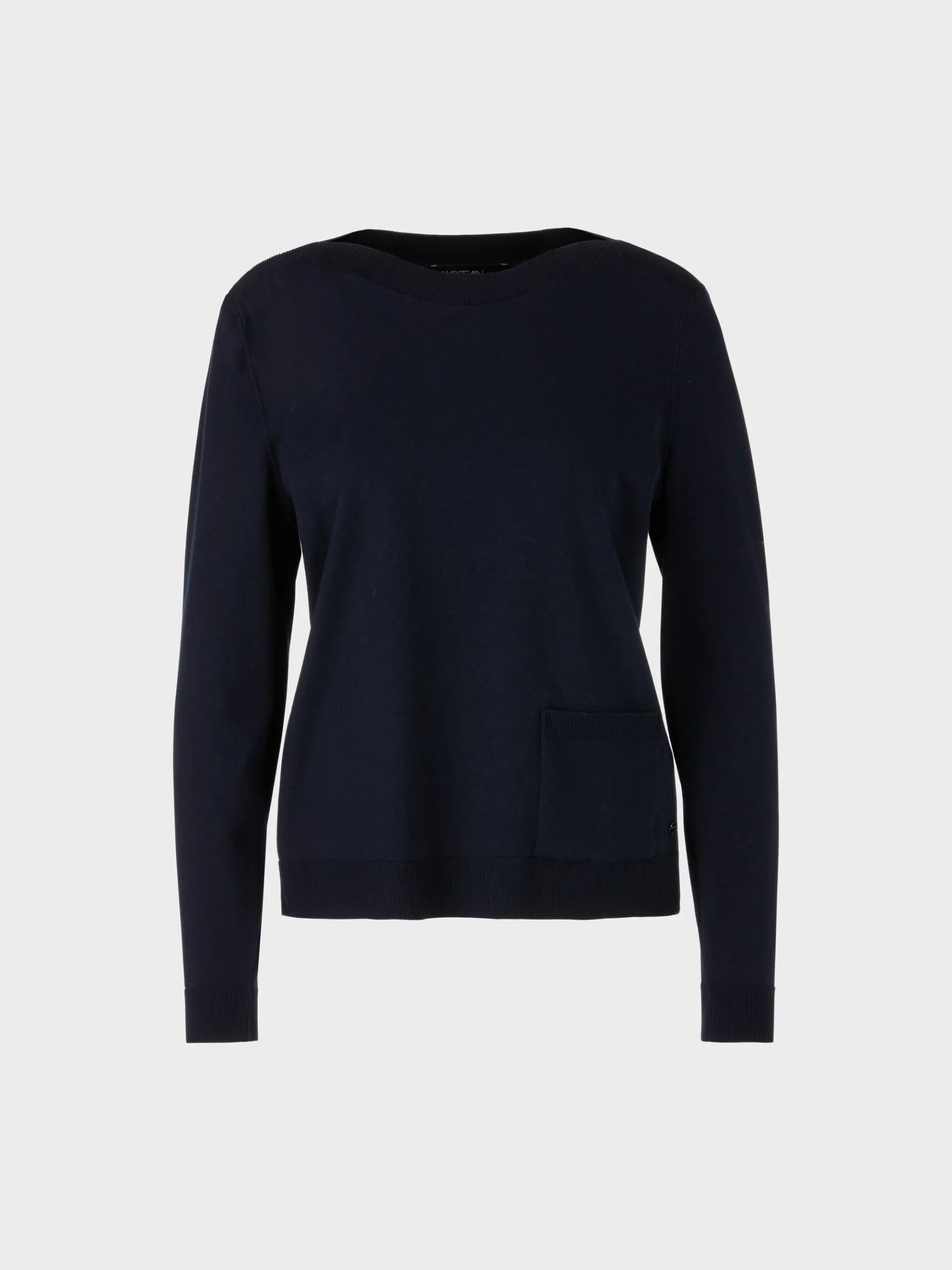 Marc Cain Essentials sweater- marine, en enkel og smart strik med lange ærmer, ribkanter og en lomme foran, strikken er med bådhals.