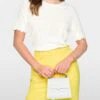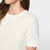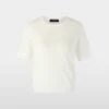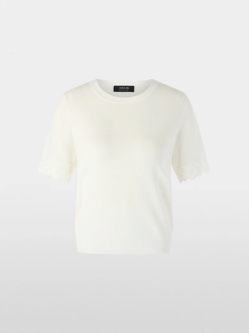 Marc Cain Glam finstrikket t-shirt – rÃ¥hvid. Denne finstrikkede t-shirt imponerer med feminint design og høj komfort ved at bære. Dens kortærmede form med en klassisk rund halsudskæring sidder behageligt ved hofterne og fremhæver silhuetten. Lavet af blød viskose giver den en let, behagelig fornemmelse. Bølgedekorerede ærmekanter tilføjer stilfulde accenter og gør denne sweater til en alsidig ledsager. Modellen er 179 cm og bruger str. N3/38