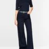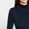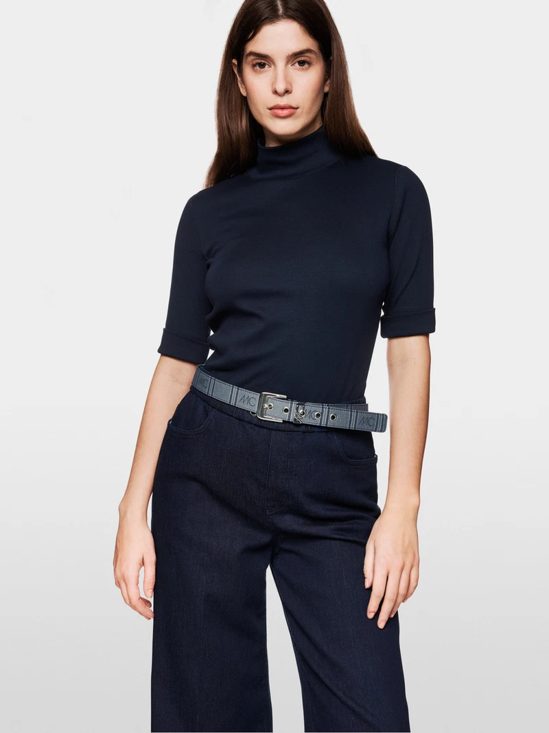 Marc Cain Sports basic trekvartærmet i navy. Slim-fit basic trekvartærmet lavet af strækbomuld for den perfekte komfort. Denne t-shirt har et ribdesign og en opretstående krave. Modellen er 179 cm og bruger str. N3/38