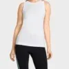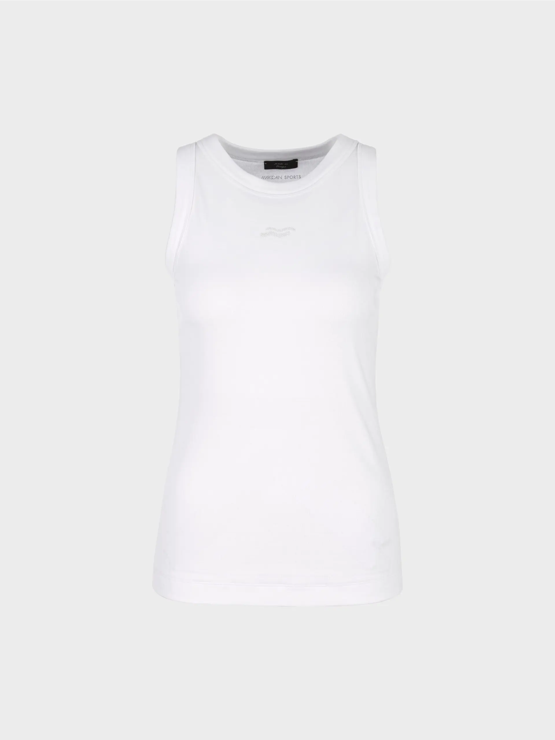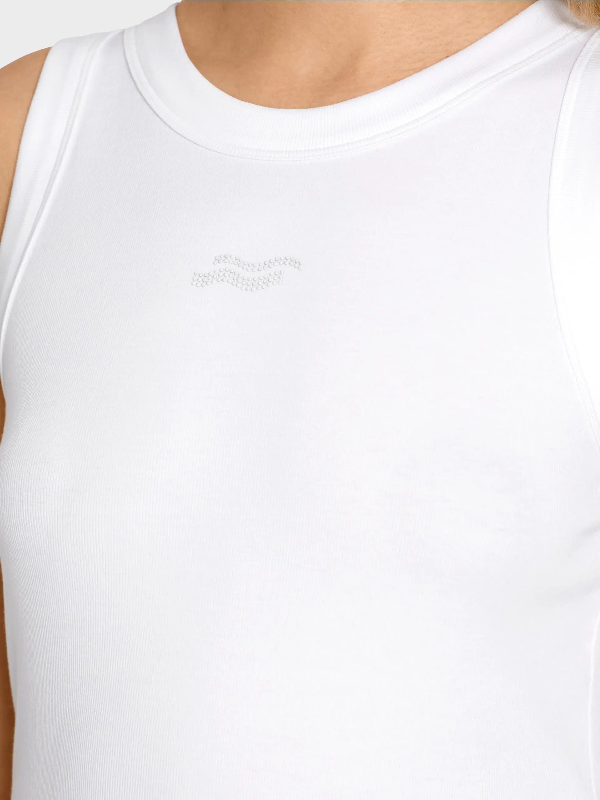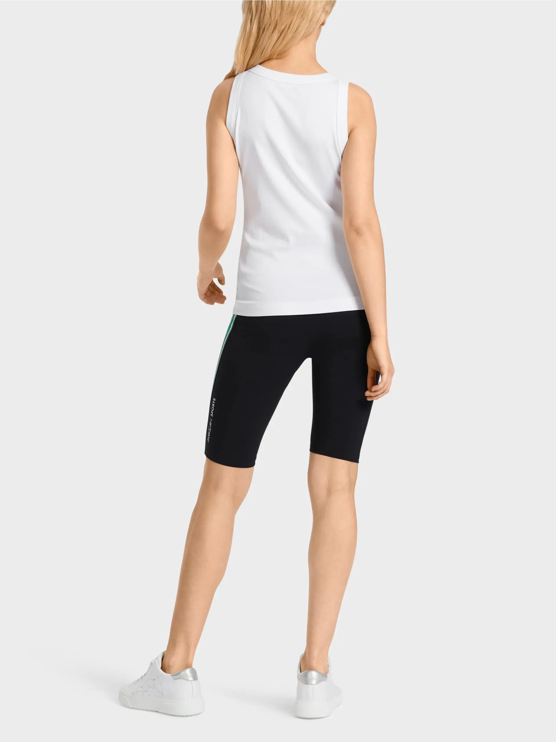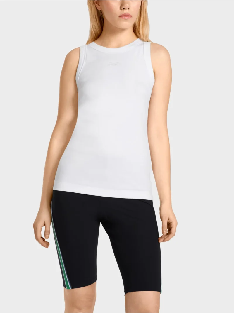 Marc Cain Sports hvid top med sten, toppen er lavet af behagelig bomuld med  lidt elastan og sten på, toppen er figursyet og er  klassisk i et sporty ribbet design og med rund hals.