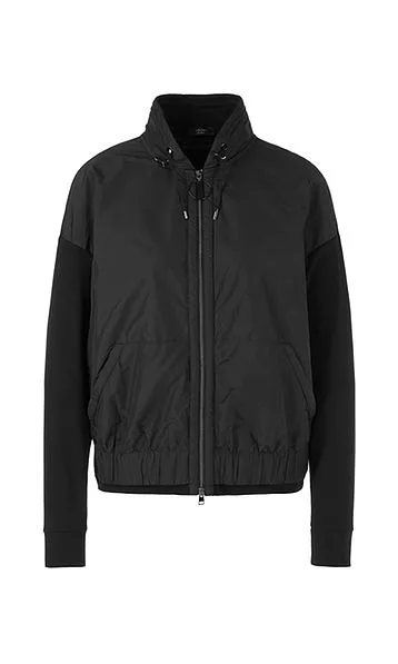 Marc Cain Sports jakke i mixed materiale med mange smarte detaljer. to vejs lynlås, stand up krave og lommer. Jakken er sort og normal i størrelsen.