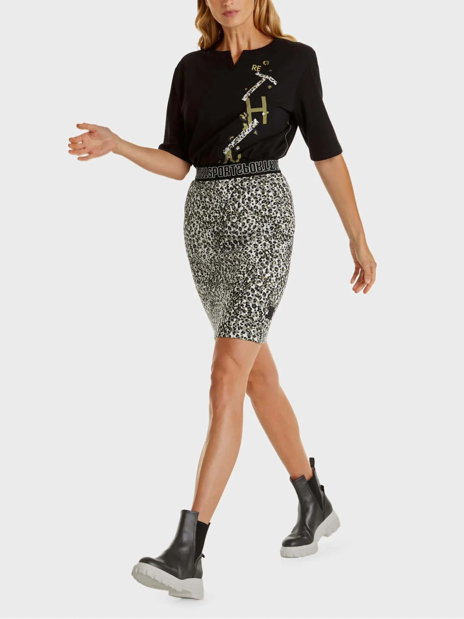 Nederdel fra Marc Cain Sports i strecth jersey, Det smarte mønster understreger den feminine, men alligevel sportslige stil. Den er foret og har elastisk linning, i farverne sort, hvid, grøn, grå. Nederdelen i  str.38 har længde 54cm.