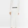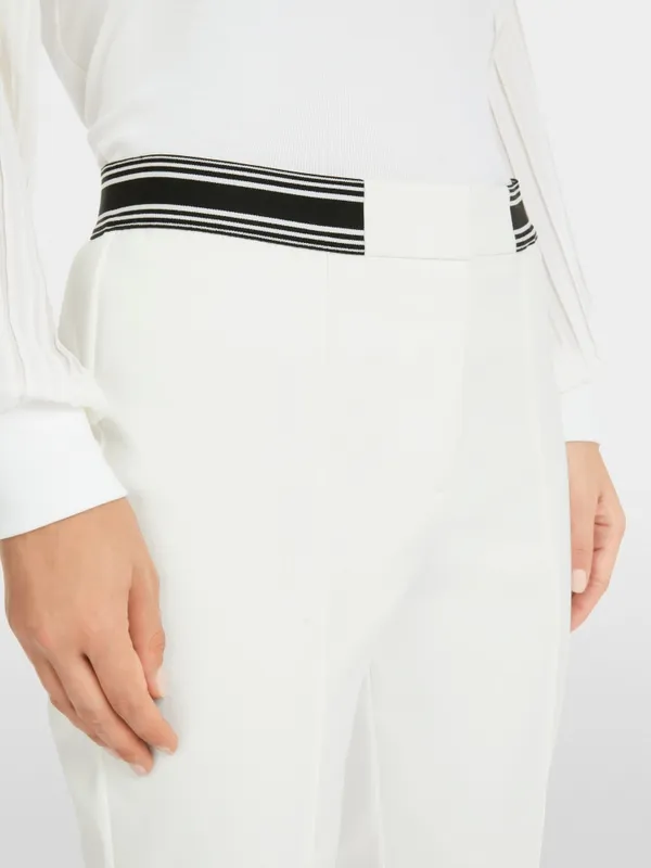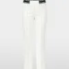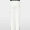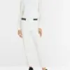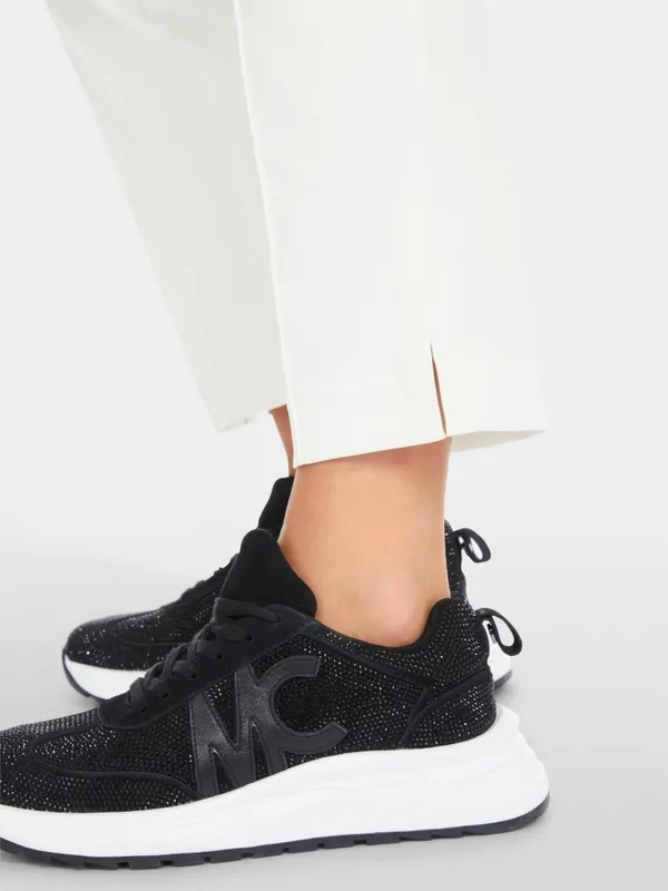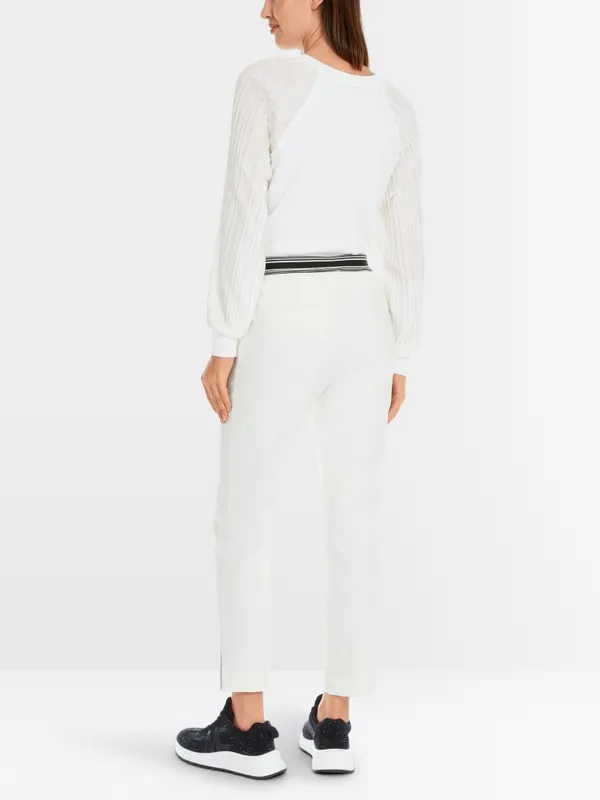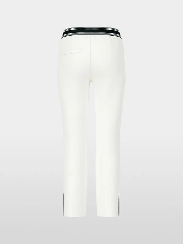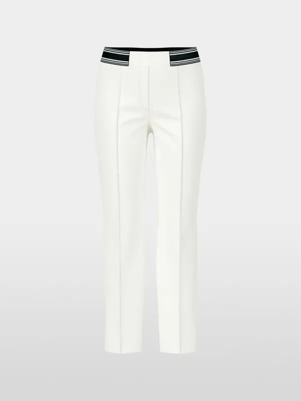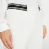 Marc Cain Sports Rethink Together bukser – SYDNEY i råhvid. SYDNEY er et par bukser med en slim silhuet, lige ben og syet kant. Den elastiske talje og det strækbare stof giver fremragende komfort og form. Beklædningen er lavet af økologisk bomuld blandet med genanvendt polyester og bærer bæredygtighedsmærket “Rethink Together.” Modellen er 179 cm og bruger str. 38