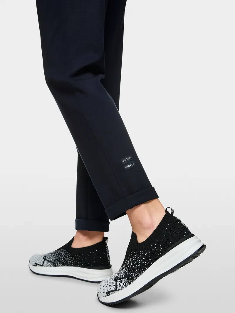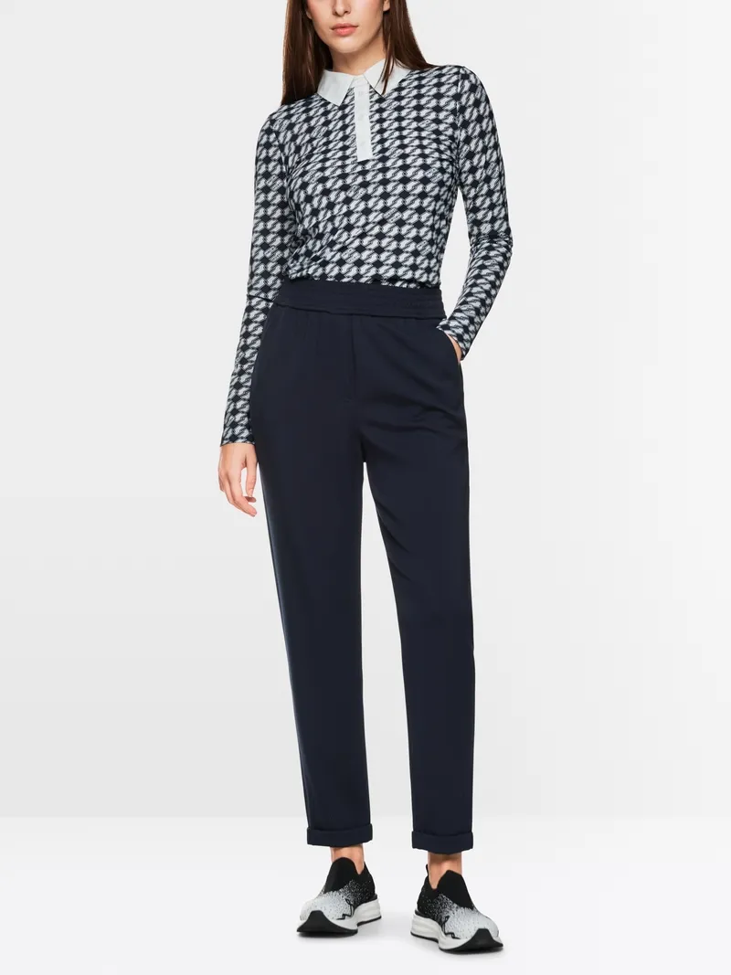 Marc Cain Sports RHODOS bukser i navy. RHODOS pull-on bukserne er lavet i meget blød viskosestretch og har en afslappet pasform. Modellen er 179 cm og bruger str. N3/38