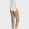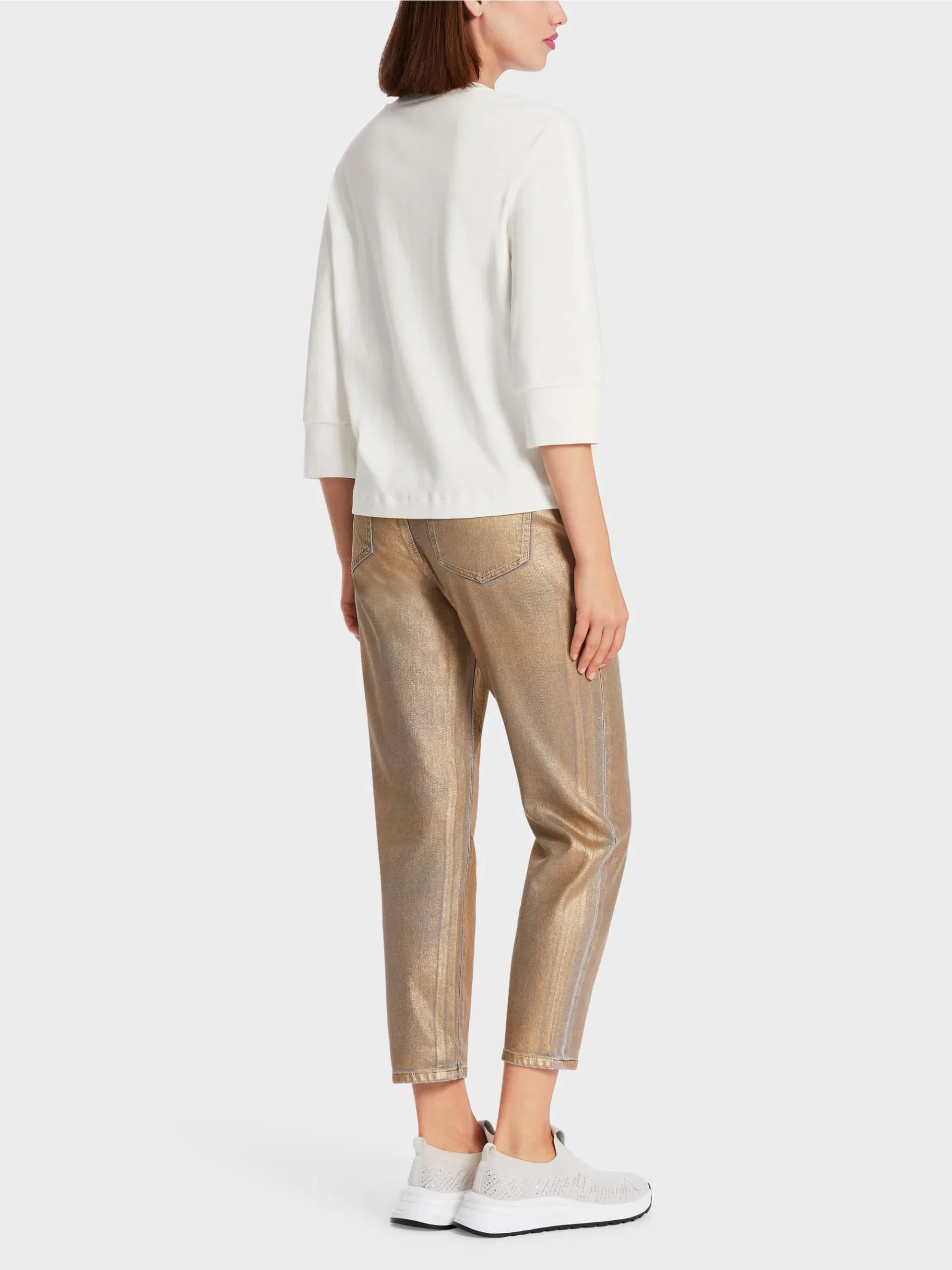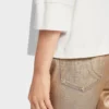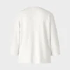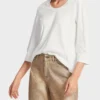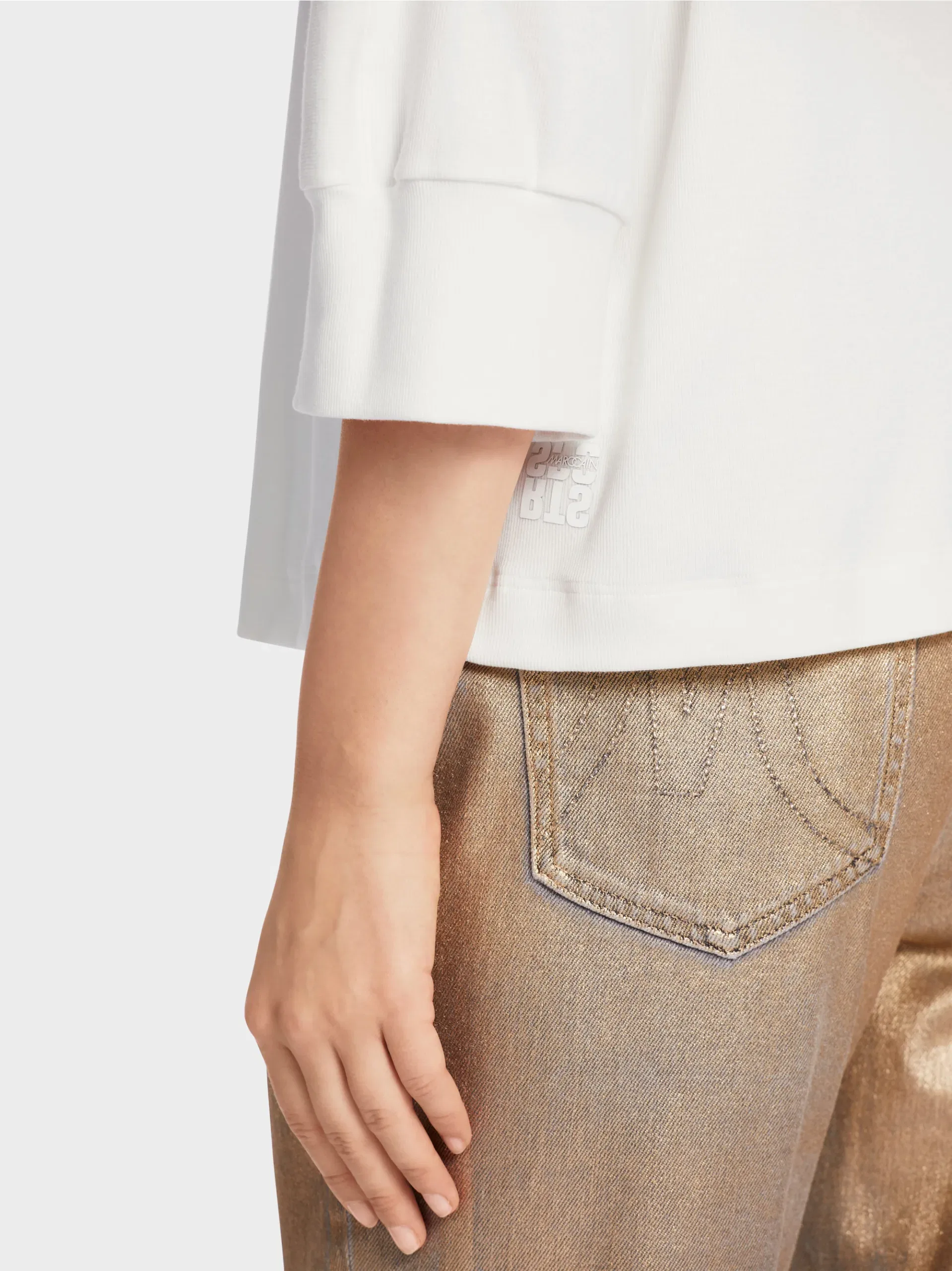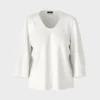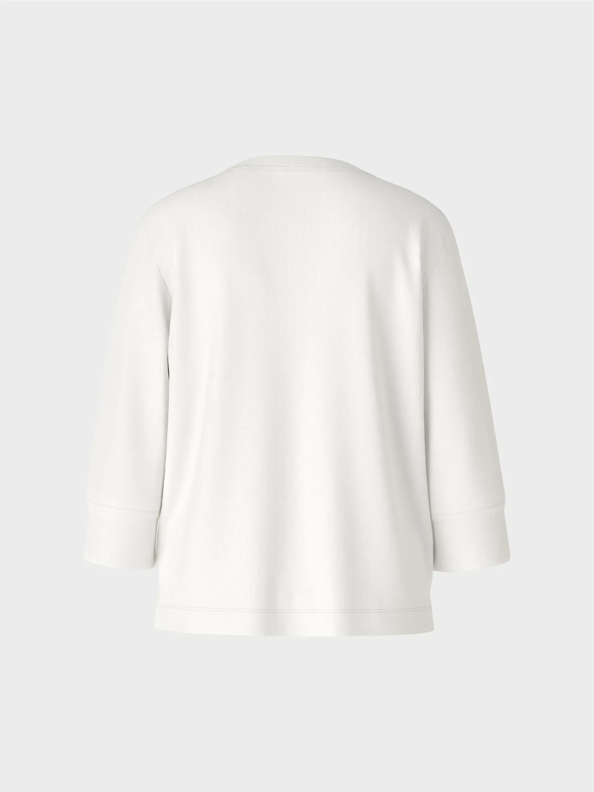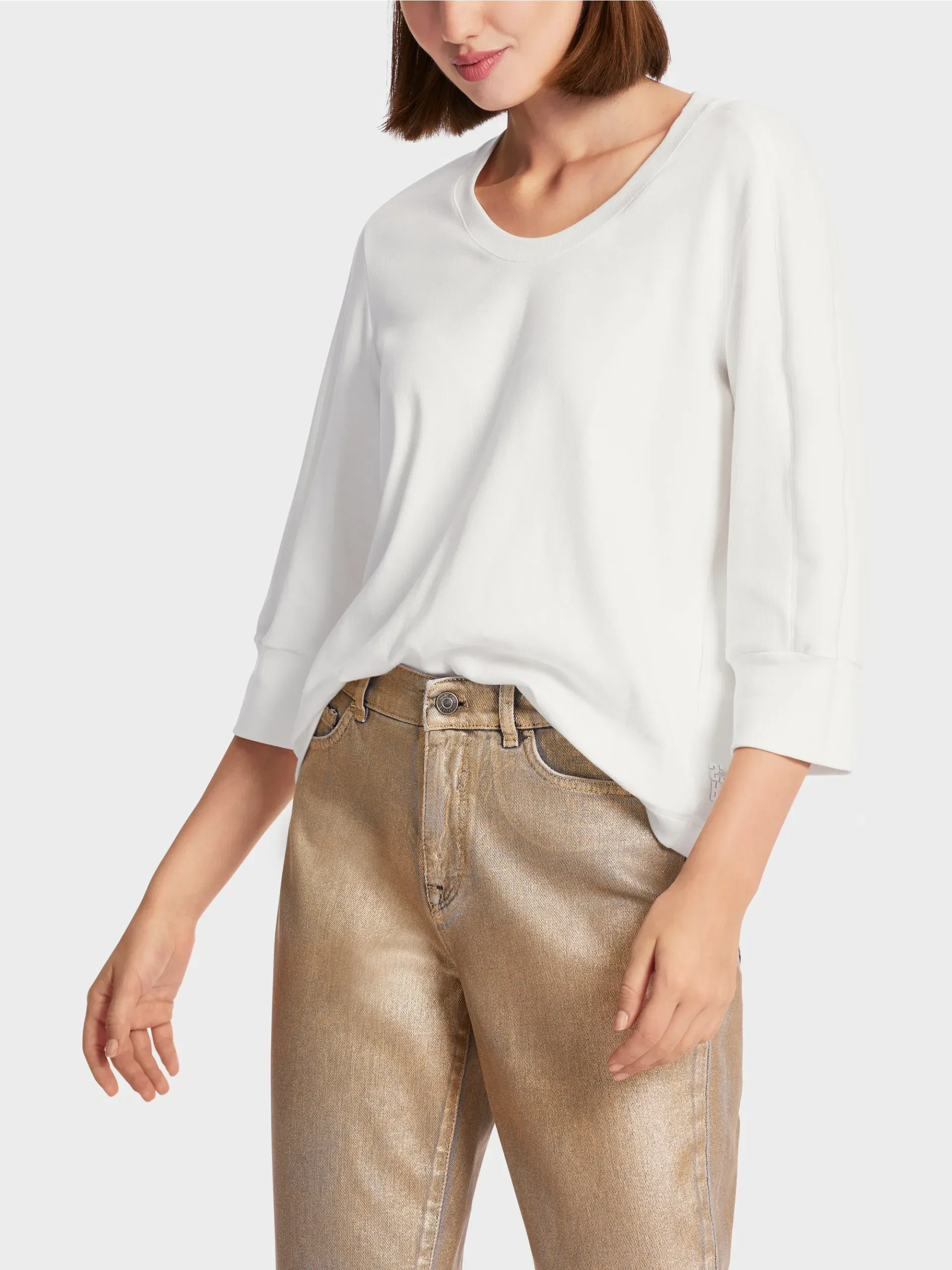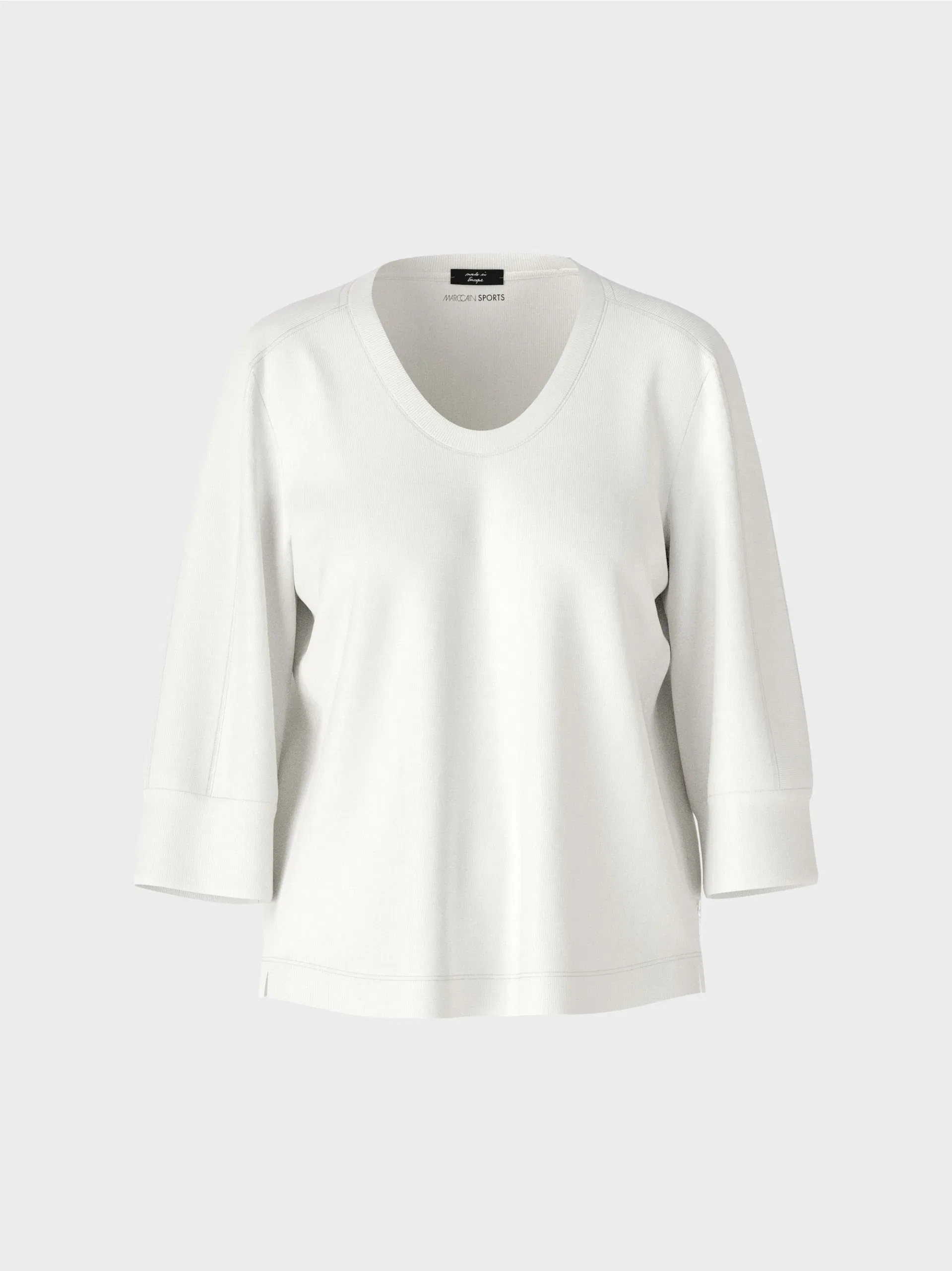 Marc Cain T-shirt med dyb rund hals i råhvid, blusen er lavet af fleksibel bomuldsrib, den er lige skåret og er rummelig. Stilfulde detaljer omfatter en dyb rund halsudskæring og 3/4-lange ærmer.