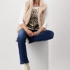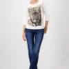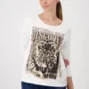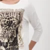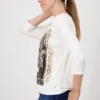 Monari bluse med leopard print og glimmer, den elastiske bluse er lavet af en viskoseblanding som er meget komfortabelt og har slidegenskaber af høj kvalitet. Et stort leopardprint med rhinsten og glitrende bogstaver pryder fronten. Blusen er med 3/4 ærmer