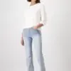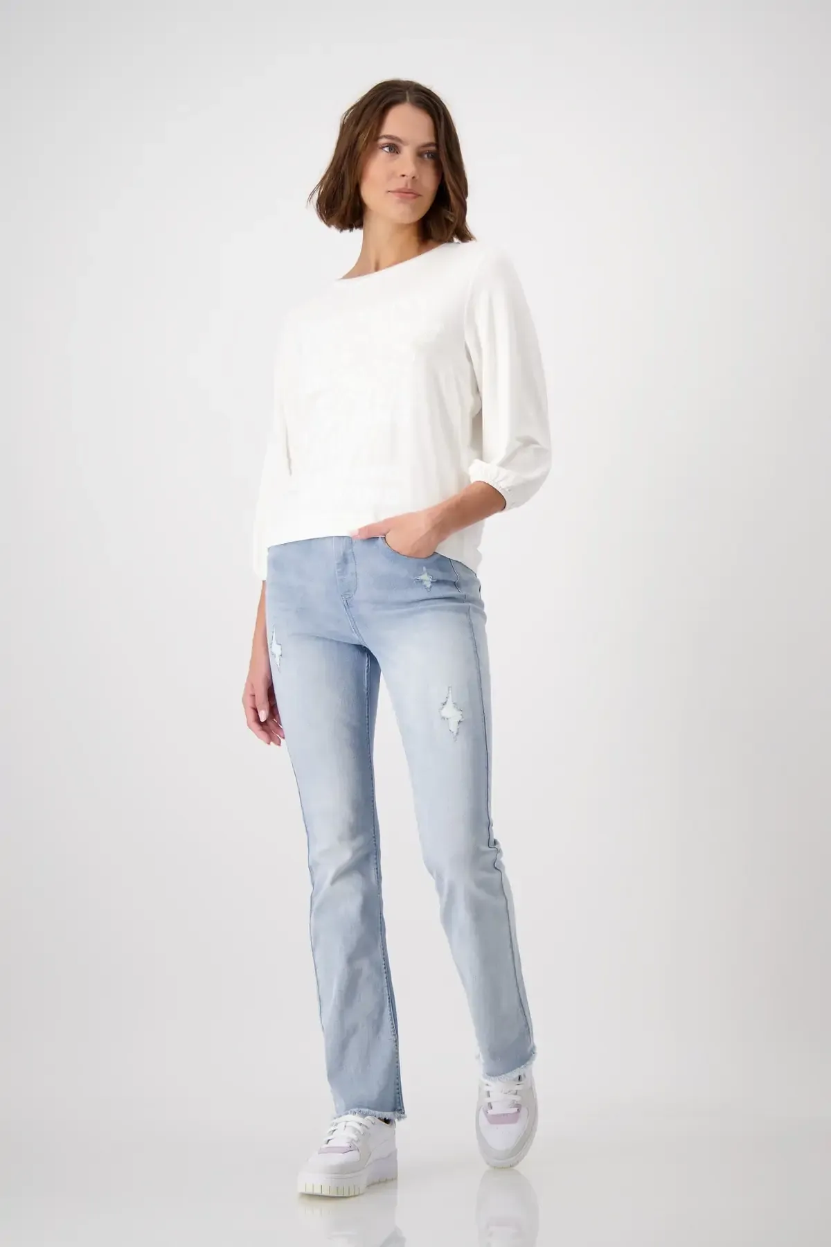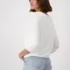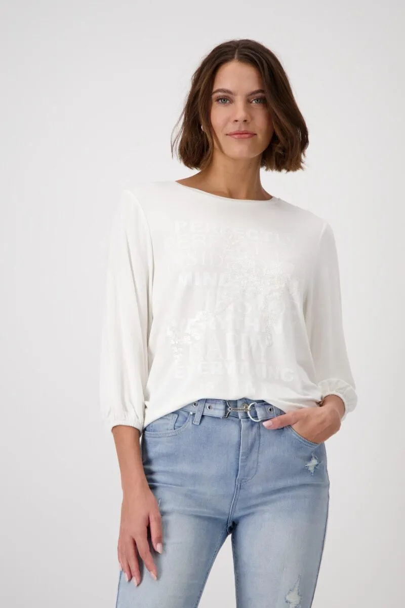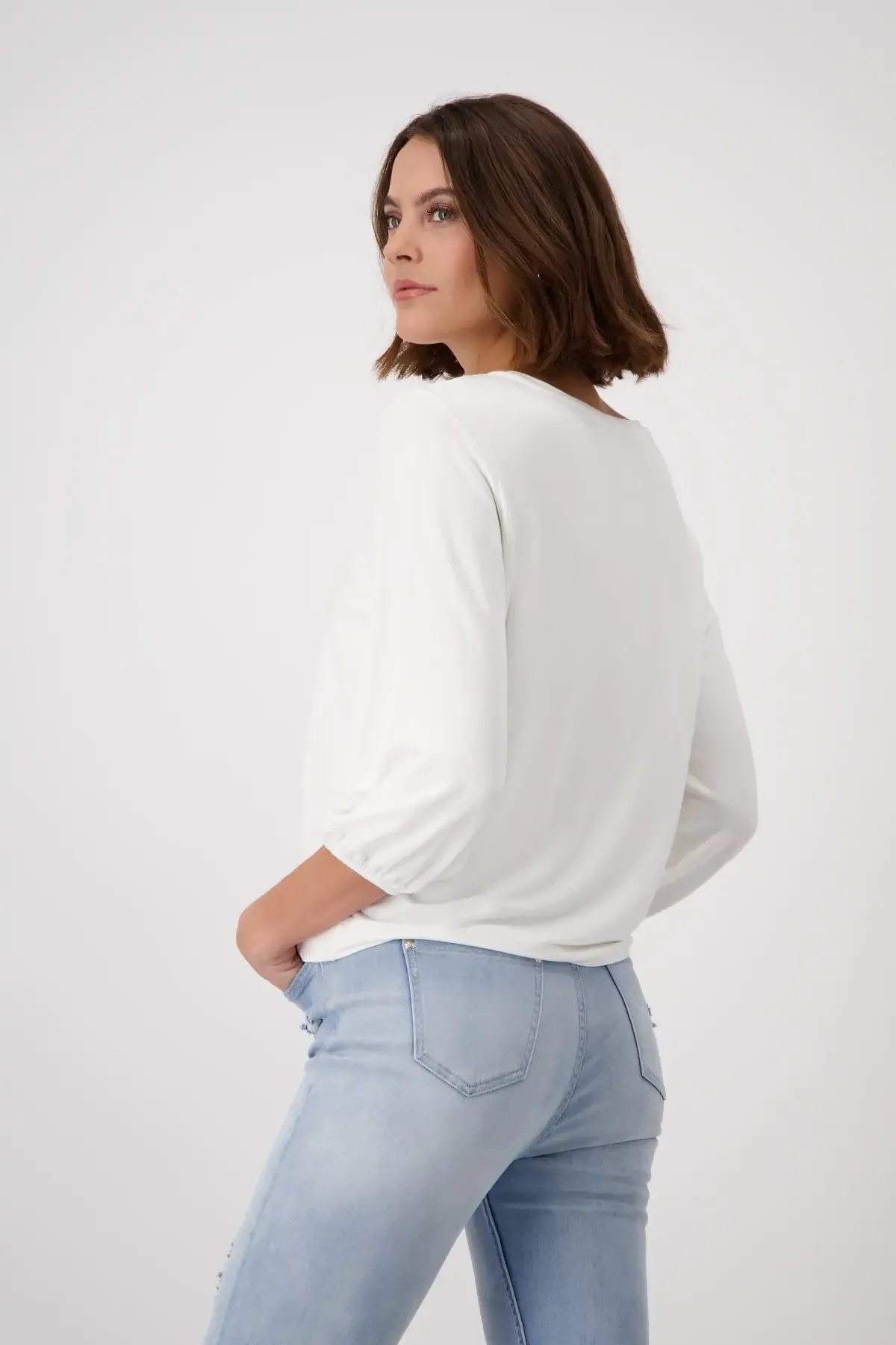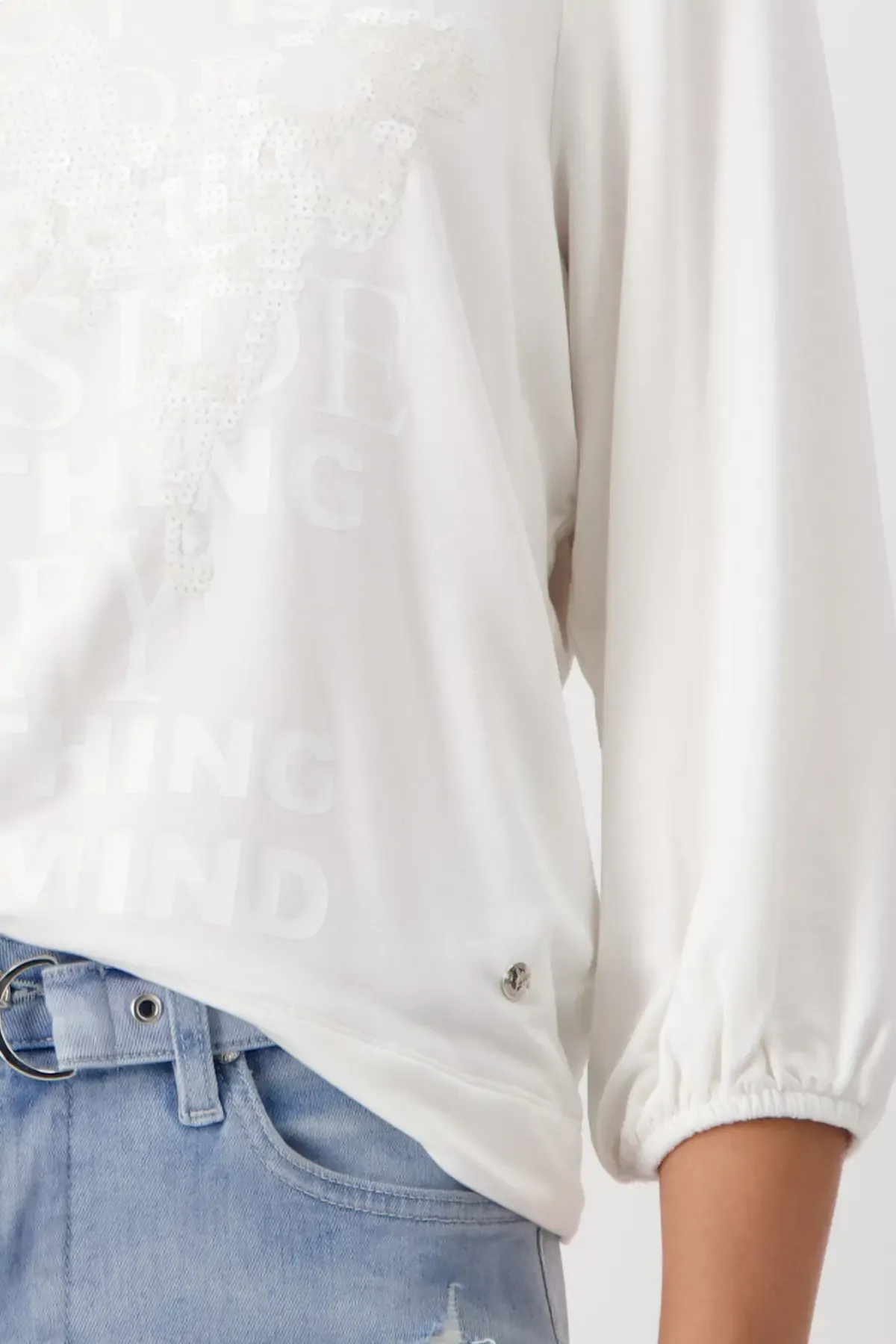 Monari bluse med pailetter i råhvid, denne bluse er på grund af elastanindholdet og den flydende viskoseblanding meget behagelig at have på, og har 3/4 ærmer med elastik.