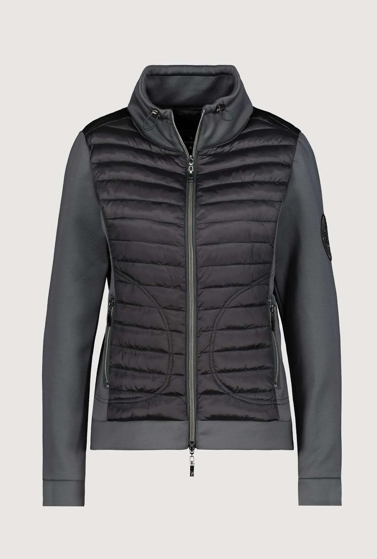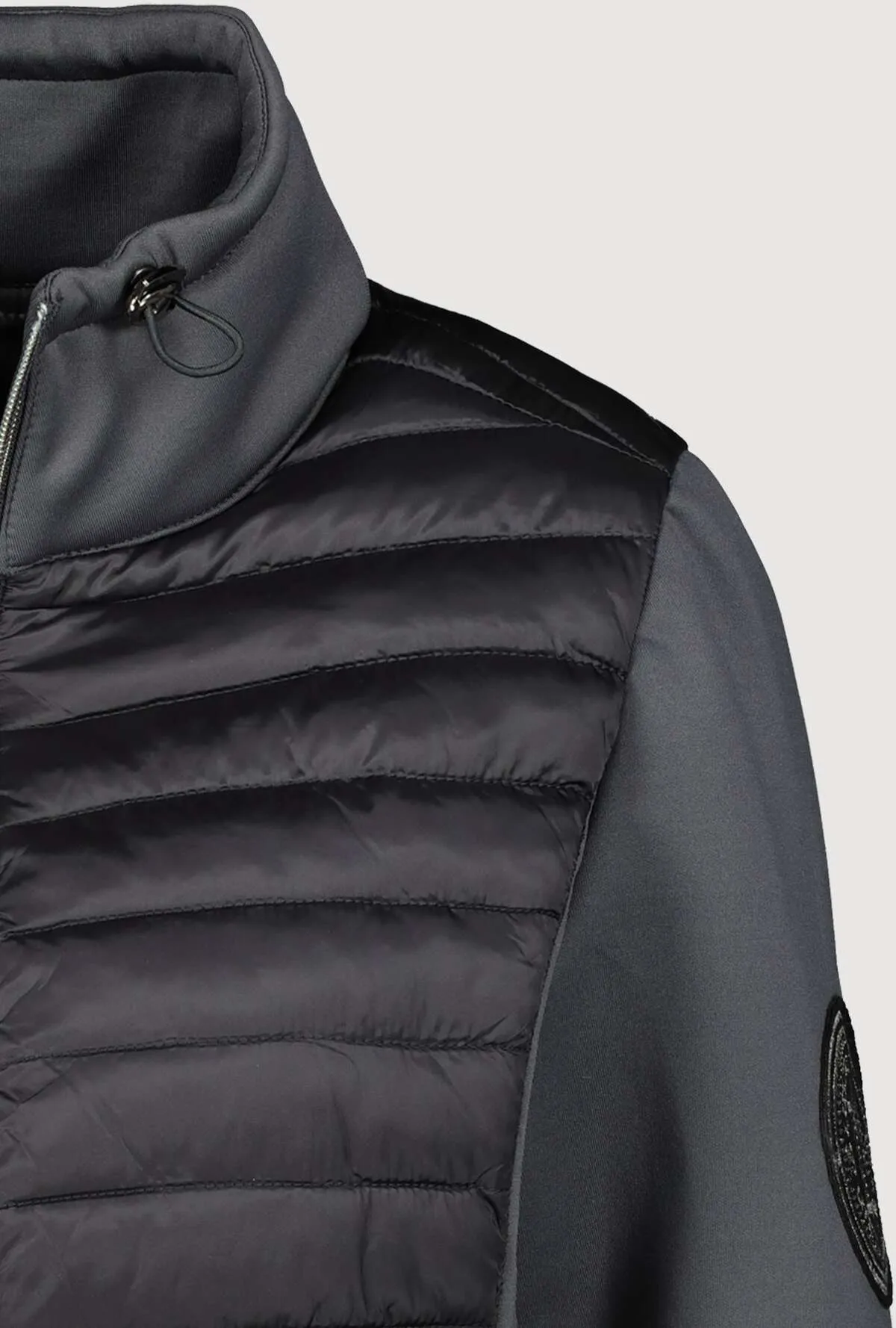 Monari Jakke med jersey ærmer med mange smarte detaljer i farven grå/blå, jakken kan snøres ind i halsen har lommer med lynlås og lynlås ned foran. Normal i størrelsen