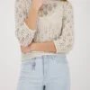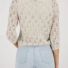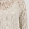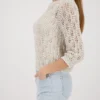 Monari strikket sweater – champagne. Elegant åbent strikket sweater lavet af bomuld af høj kvalitet og flydende viskose, 3/4 ærmer og dekoreret med skinnende Lurex. Modellen er 178 cm og bruger str. 36