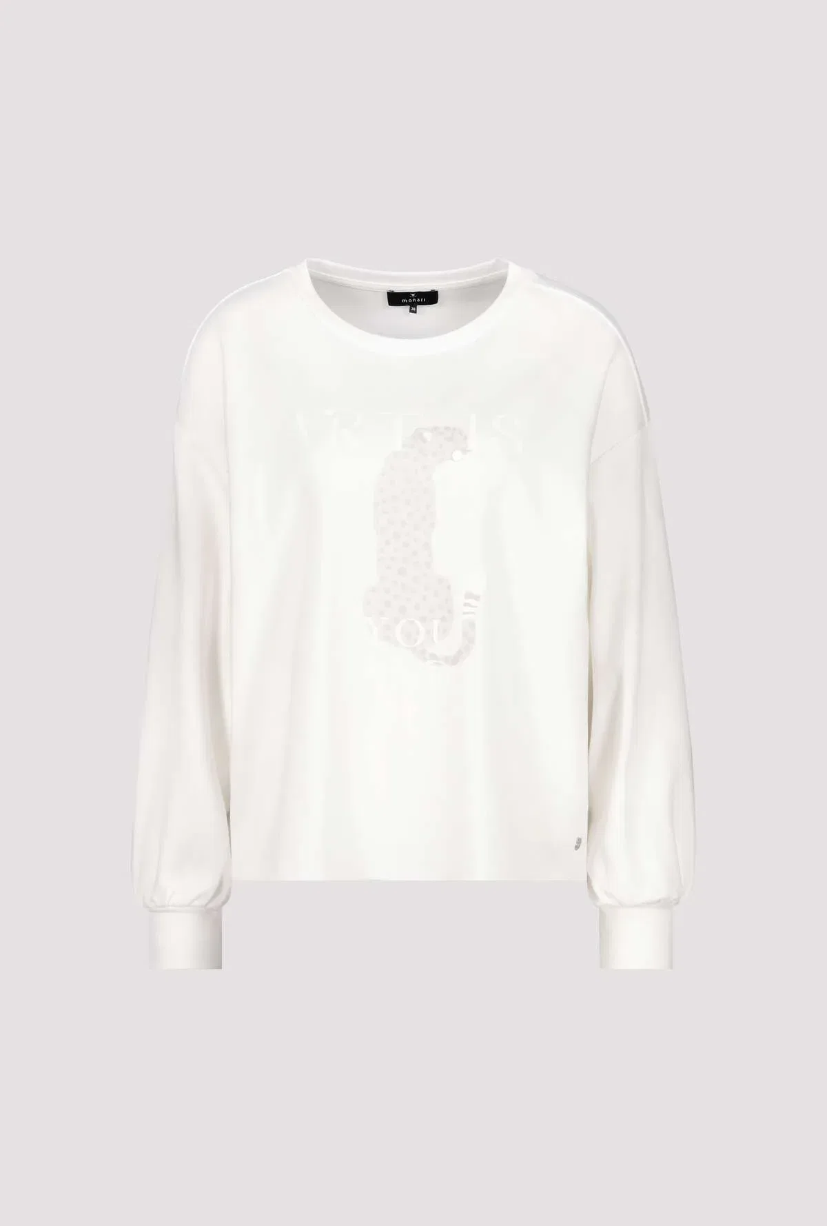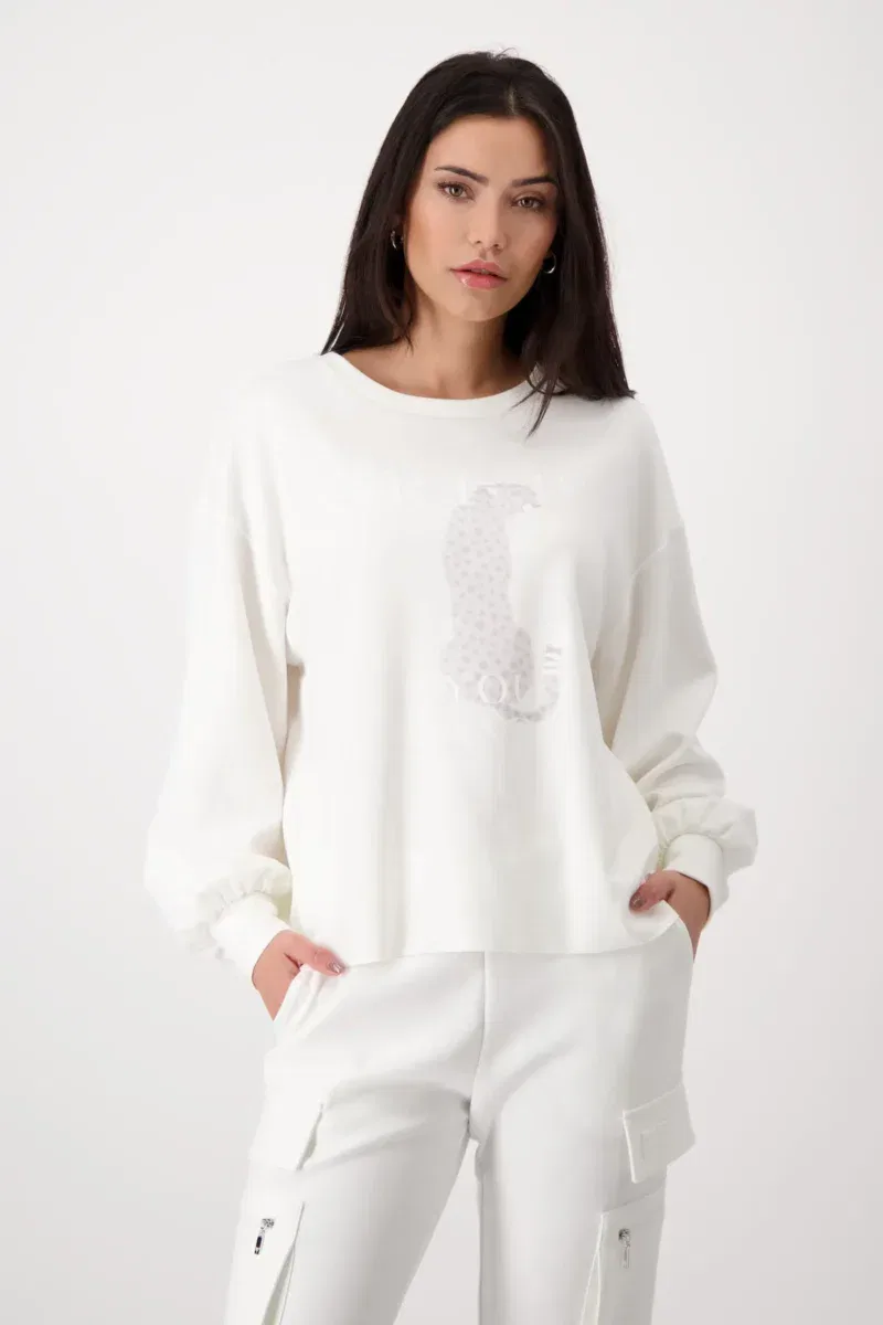 Monari sweatshirt i råhvid, Trendy sweatshirt med leopardprint og rund hals, blusen har lange ærmer er lidt bred i modellen og stor i størrelsen. Modellen er 1,77 m høj og bruger størrelse 36.
