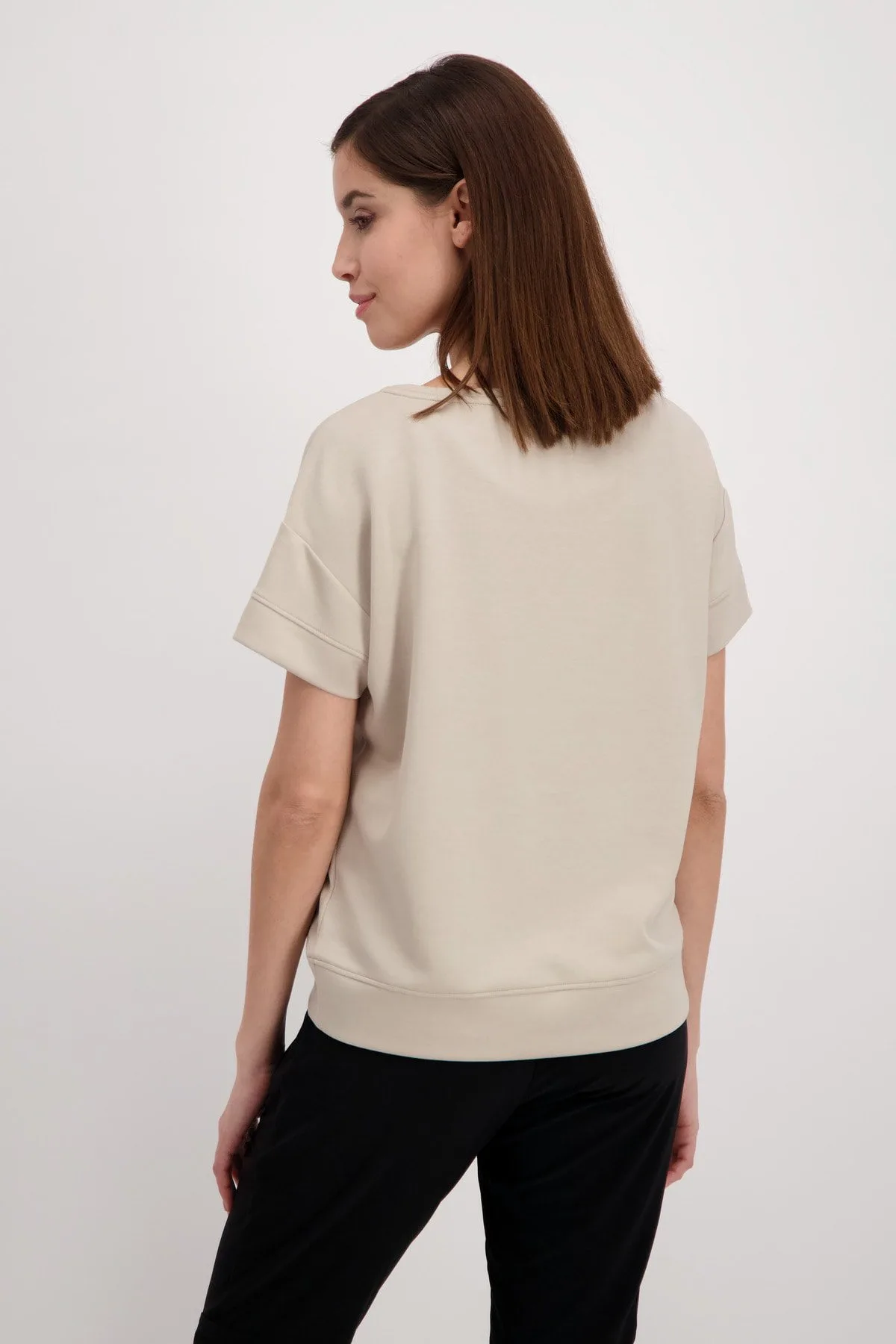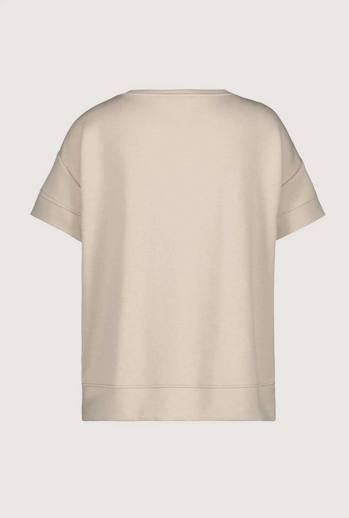 Monari T-shirt med pailetter og tryk sand, blusen har V hals og korte ærmer og rummelig i størrelsen.