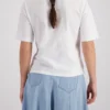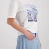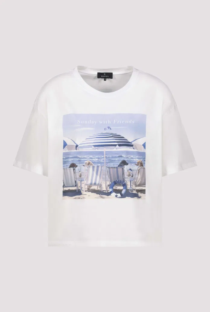 Monari t-shirt med print – råhvid. Denne 100% bomulds t-shirt føles smukt blød og har et fantastisk trendy beach dog-print og et afslappet kortærmet design for et stilfuldt look. Modellen er 178 cm og bruger str. 36. Længden af str. 38 er 58 cm.