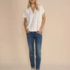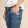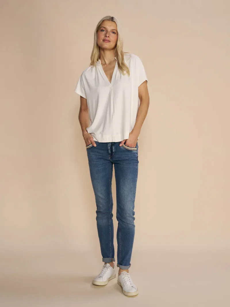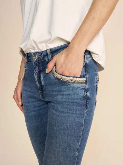 Mos Mosh Naomi Mateos Jeans, Alsidige jeans med tapered ben og høj/middel talje for max. fleksibilitet. Disse jeans er en af MOS MOSH’s mest populære modeller, som både kan sættes lavt på hoften eller højere oppe i taljen for et mere elegant look. Med flotte lurex-syninger og diskrete kædedetaljer ved lommerne.