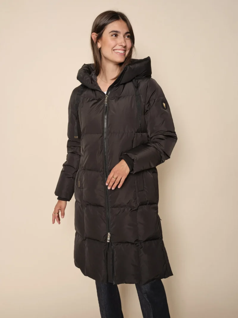 Mos Mosh Nova Square Down Frakke Sort, denne frakke har ternede paneler i blød dun, høj krave med snøreluk og hætte. Lynlås der kan åbnes fra bunden, og giver dig dermed mere fleksibilitet hvis du cykler, frakken har et let feel takket være det ansvarligt producerede dun.