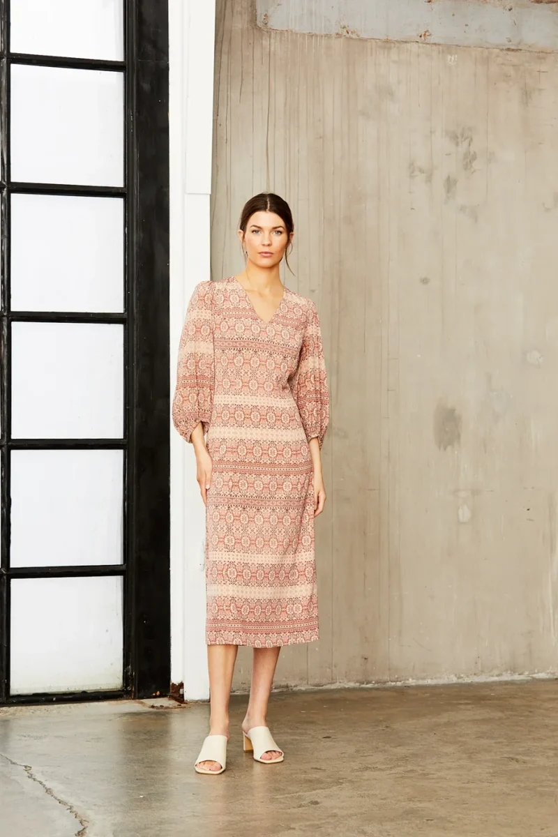Pbo Banjola dress, lang kjole i silke i et meget smukt mønster, kjolen har indsnit foran og bagpå, V-hals – 3/4lange ærmer med elastik 0g normal i størrelsen