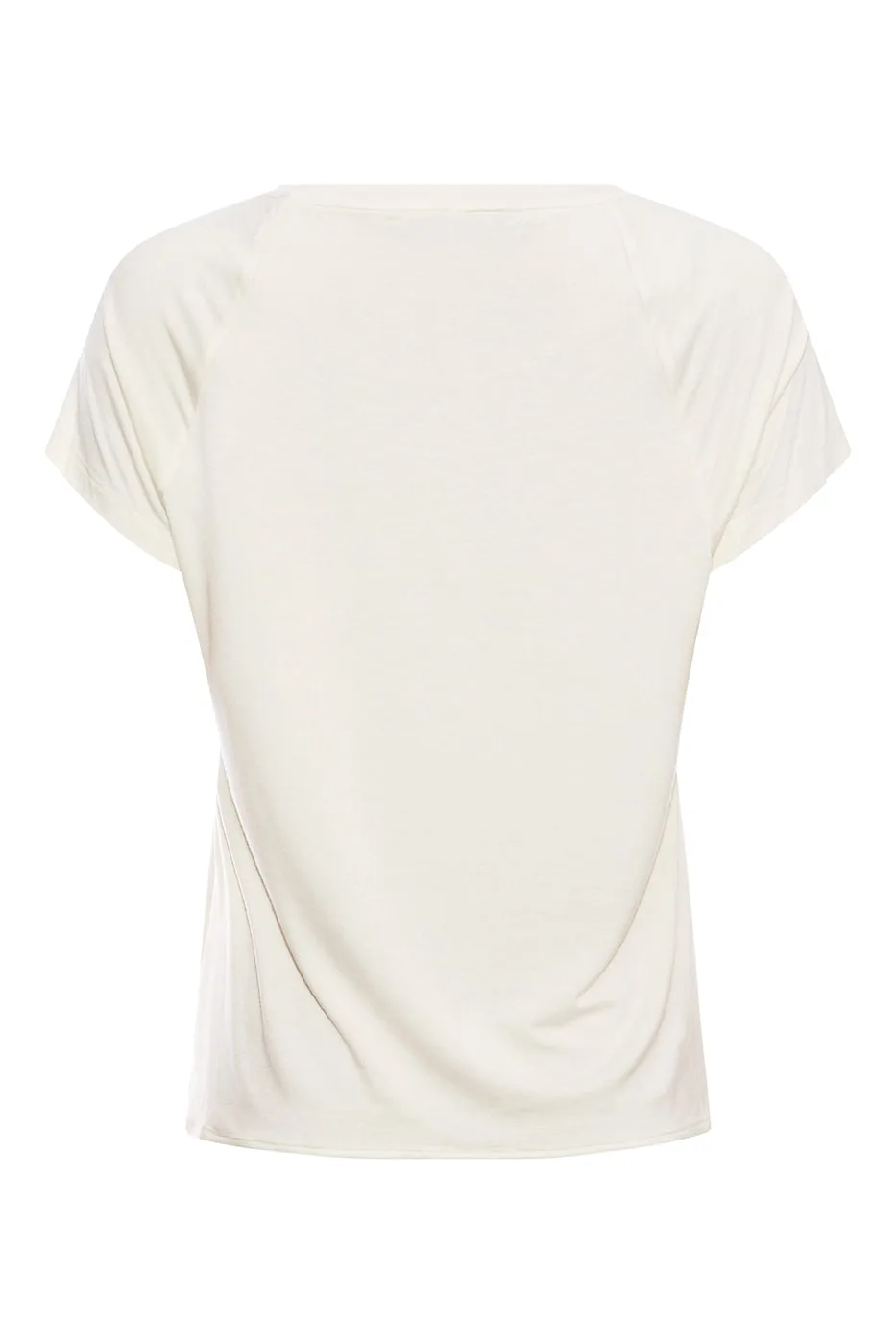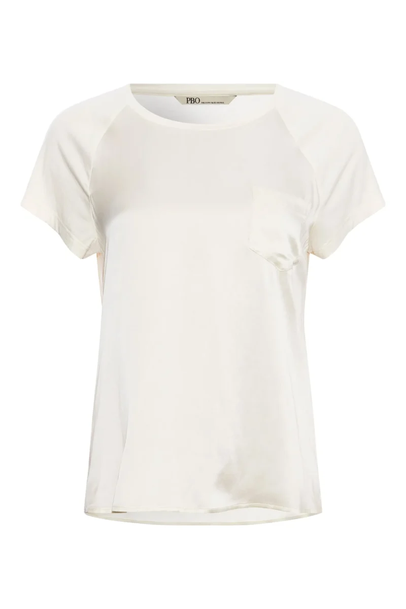 PBO Bassi top i Ecru, bluse med bred halsudskæring og korte raglanærmer. Blusen er af silke fortil og viskose bagpå og er detaljeret med en lille lomme på brystet.