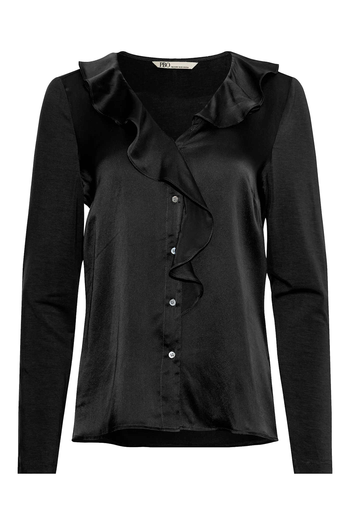 PBO Indo shirt black, blusen er langærmet med v-udskæring og er gennemknappet. Blusen er i silke fortil og viskose bagpå og har flæser langs halsudskæringen. Normal i størrelsen