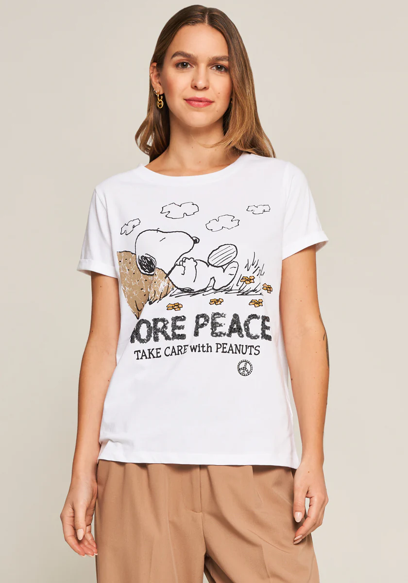 Princess Goes Hollywood t-shirt Snoopy. T-shirt i ren bomuld med rund hals og korte ærmer med opbuk. Snoopy-print på forsiden med “More Peace”-tekst, samt pailletter og rhinsten.