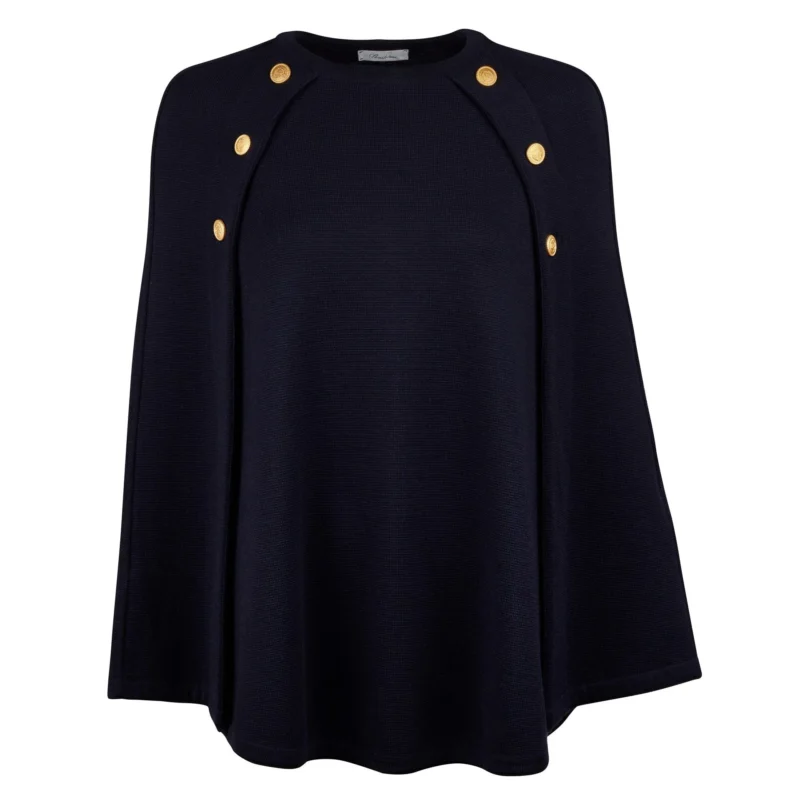 marineblå Cape i merinould med 6 ikoniske guldknapper og rund hals.