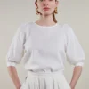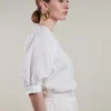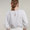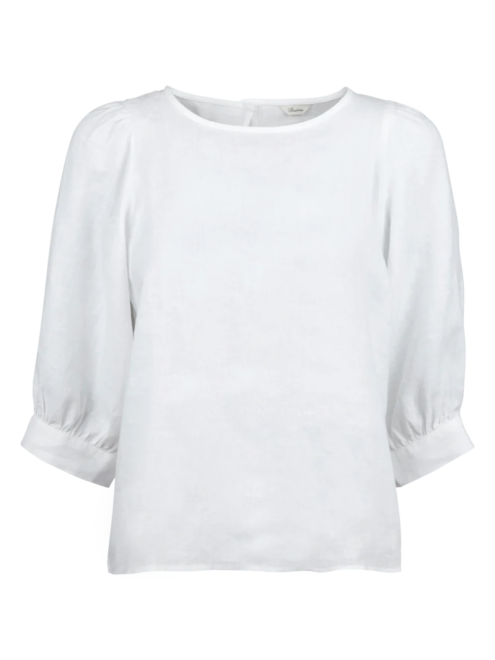 Stenstrøms Carmen hørbluse. Fin og feminin bluse med små læg i ærmet der afsluttes med en knap, og danner en lille ballon effekt. Modellen har rund hals, som lukkes med en knap i nakken. Modellen er 180 cm og bruger str. 36