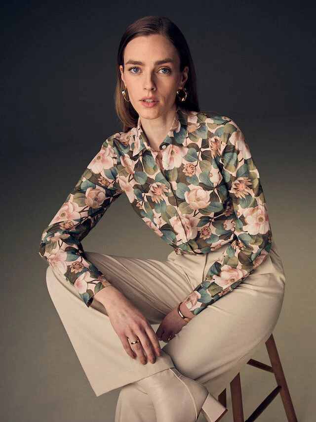 Stenstrøms Sofie Lyserød mønstret skjorte – feminine,lækker blød skjorte i et meget flot mønster, skjorten er model Feminine og er gennemknappet med krave og manchetter på ærmerne, normal i størrelsen